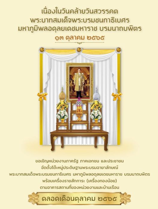 รัฐบาล ขอเชิญหน่วยงานภาครัฐ ภาคเอกชน และประชาชน ร่วมกิจกรรมน้อมรำลึก เนื่องในวันคล้ายวันสวรรคต พระบาทสมเด็จพระบรมชนกาธิเบศร มหาภูมิพลอดุลยเดชมหาราช บรมนาถบพิตร 13 ตุลาคม 2565 จัดตั้งโต๊ะหมู่ประดิษฐานพระบรมฉายาลักษณ์ พระบาทสมเด็จพระบรมชนกาธิเบศร มหาภูมิพลอดุลยเดชมหาราช บรมนาถบพิตร พร้อมเครื่องราชสักการะ (เครื่องทองน้อย) ตามอาคารสถานที่ของหน่วยงานและบ้านเรือน ตลอดเดือนตุลาคม 2565