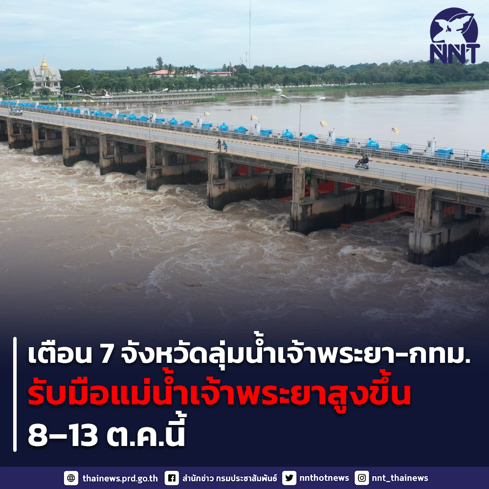 กรมป้องกันและบรรเทาสาธารณภัย แจ้ง 7 จังหวัด ได้แก่ ชัยนาท สิงห์บุรี อ่างทอง พระนครศรีอยุธยา ปทุมธานี นนทบุรี และสมุทรปราการ และกรุงเทพมหานคร เตรียมรับมือแม่น้ำเจ้าพระยาสูงขึ้น ในช่วงวันที่ 8 – 13 ตุลาคม 2565