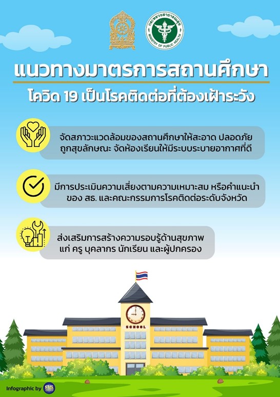 กระทรวงศึกษาธิการ (ศธ.) ร่วมกับกระทรวงสาธารณสุข (สธ.) กำหนดแนวทางดำเนินการของสถานศึกษาและแนวทางปฏิบัติของนักเรียนและบุคลากร เพื่อป้องกันการติดเชื้อและการแพร่ระบาดโรคโควิด 19 ในสถานศึกษา หลังปรับเป็นโรคติดต่อที่ต้องเฝ้าระวัง ตั้งแต่วันที่ 1 ต.ค. 65 เป็นต้นมา โดยเน้นย้ำถึงการจัดการเรียนการสอนที่เหมาะสมกับสถานการณ์ ให้ทุกคนปฏิบัติตามสุขอนามัย พร้อมเร่งสร้างความรู้ความเข้าใจให้กับครู บุคลากร นักเรียน และผู้ปกครอง ดังนี้