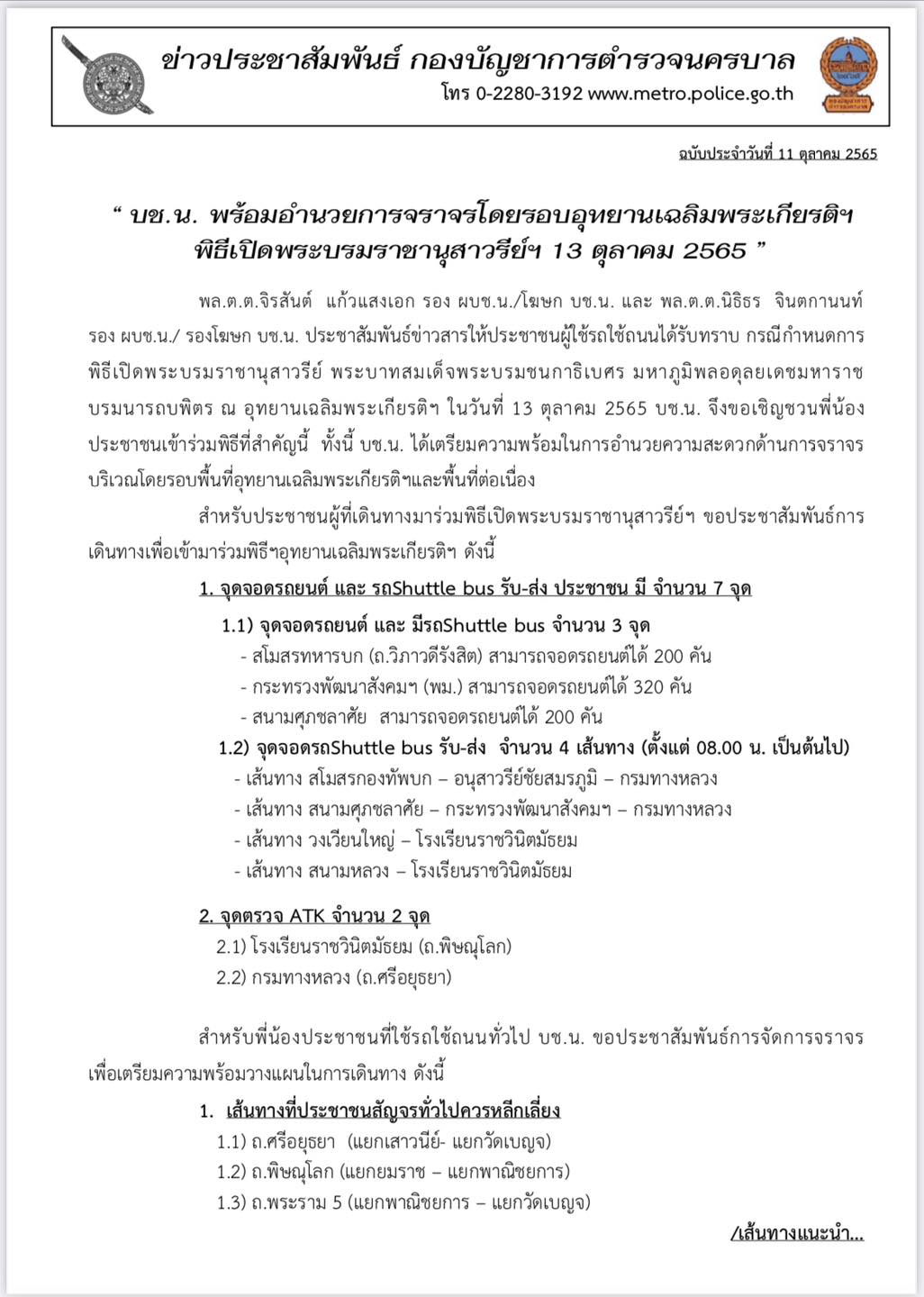 กองบัญชาการตำรวจนครบาล ขอประชาสัมพันธ์การจัดการจราจร เพื่อเตรียมความพร้อมวางแผนในการเดินทาง พิธีเปิดพระบรมราชานุสาวรีย์ พระบาทสมเด็จพระบรมชนกาธิเบศร มหาภูมิพลอดุลยเดชมหาราช บรมนารถบพิตร วันที่ 13 ตุลาคม 2565