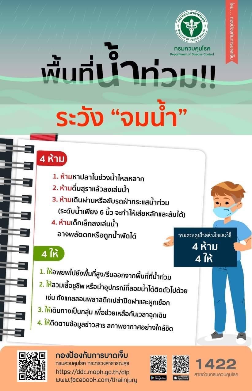 กรมควบคุมโรค แนะนำประชาชนในพื้นที่น้ำท่วม ระวัง จมน้ำ พร้อมแนะวิธี 4 ห้าม 4 ให้ เพื่อความปลอดภัยขณะเกิดน้ำท่วม