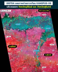 GISTDA เปิดเผยภาพถ่ายจากดาวเทียม ของวันที่ 17 ตุลาคม 2565 แสดงให้เห็นถึงพื้นที่น้ำท่วมขัง (สีเขียว) ในเขตพื้นที่บางส่วนของ จังหวัดบุรีรัมย์ และจังหวัดสุรินทร์