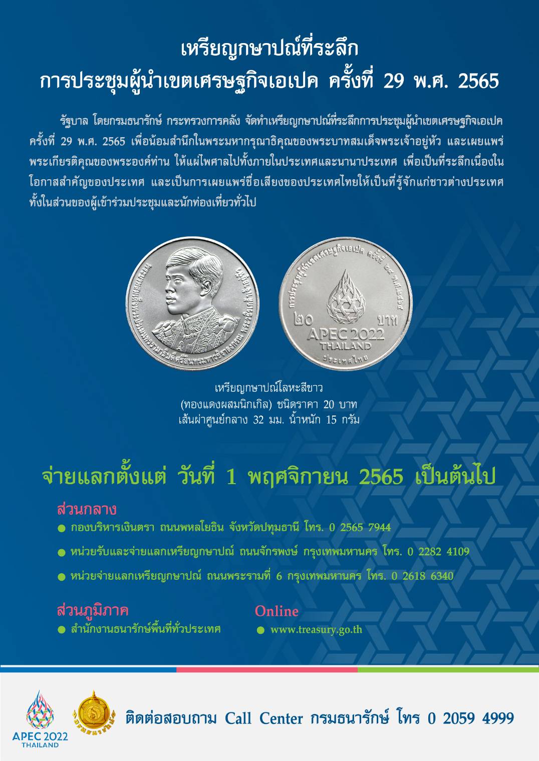 กรมธนารักษ์ เปิดจ่ายแลกเหรียญกษาปณ์ที่ระลึกการประชุมผู้นำเขตเศรษฐกิจเอเปค ครั้งที่ 29 พ.ศ. 2565