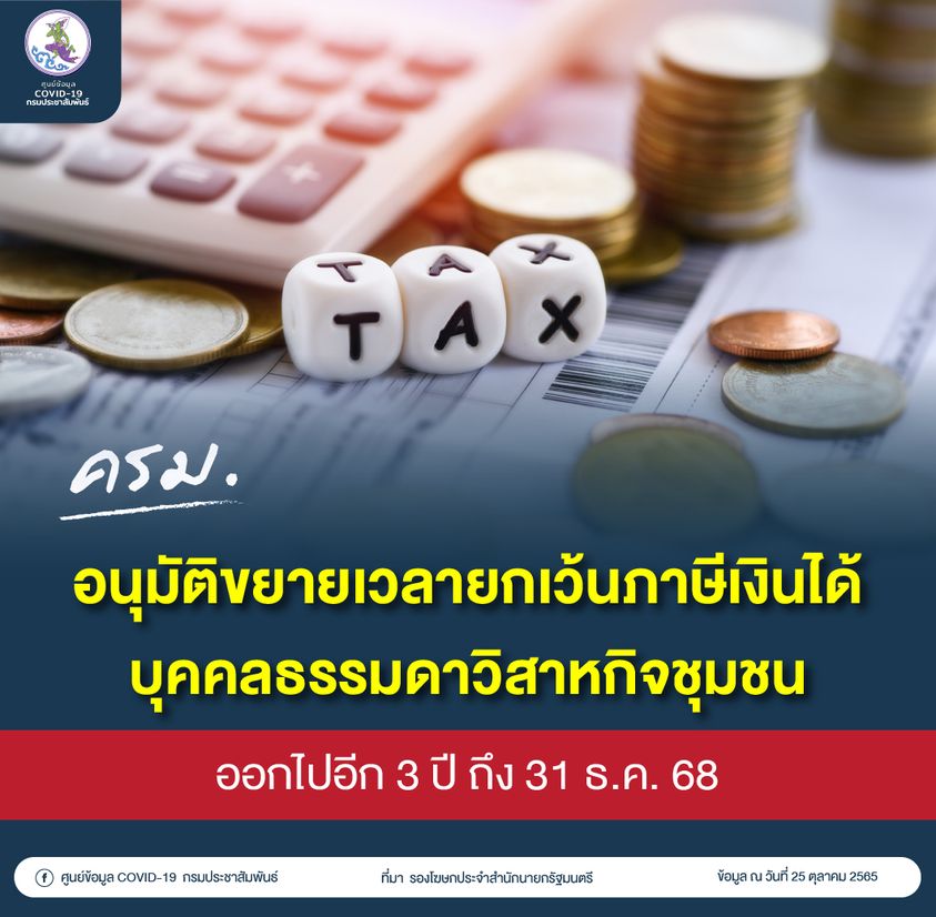 ครม. อนุมัติหลักการร่างกฎกระทรวงการคลังขยายเวลายกเว้นภาษีเงินได้บุคคลธรรมดาวิสาหกิจชุมชนต่อไปอีก 3 ปี เพื่อเป็นการดูแลวิสาหกิจชุมชนต่อไป ซึ่งเดิมจะสิ้นสุดที่ 31 ธ.ค. 65 ได้ขยายไปจนถึงวันที่ 31 ธันวาคม 2568