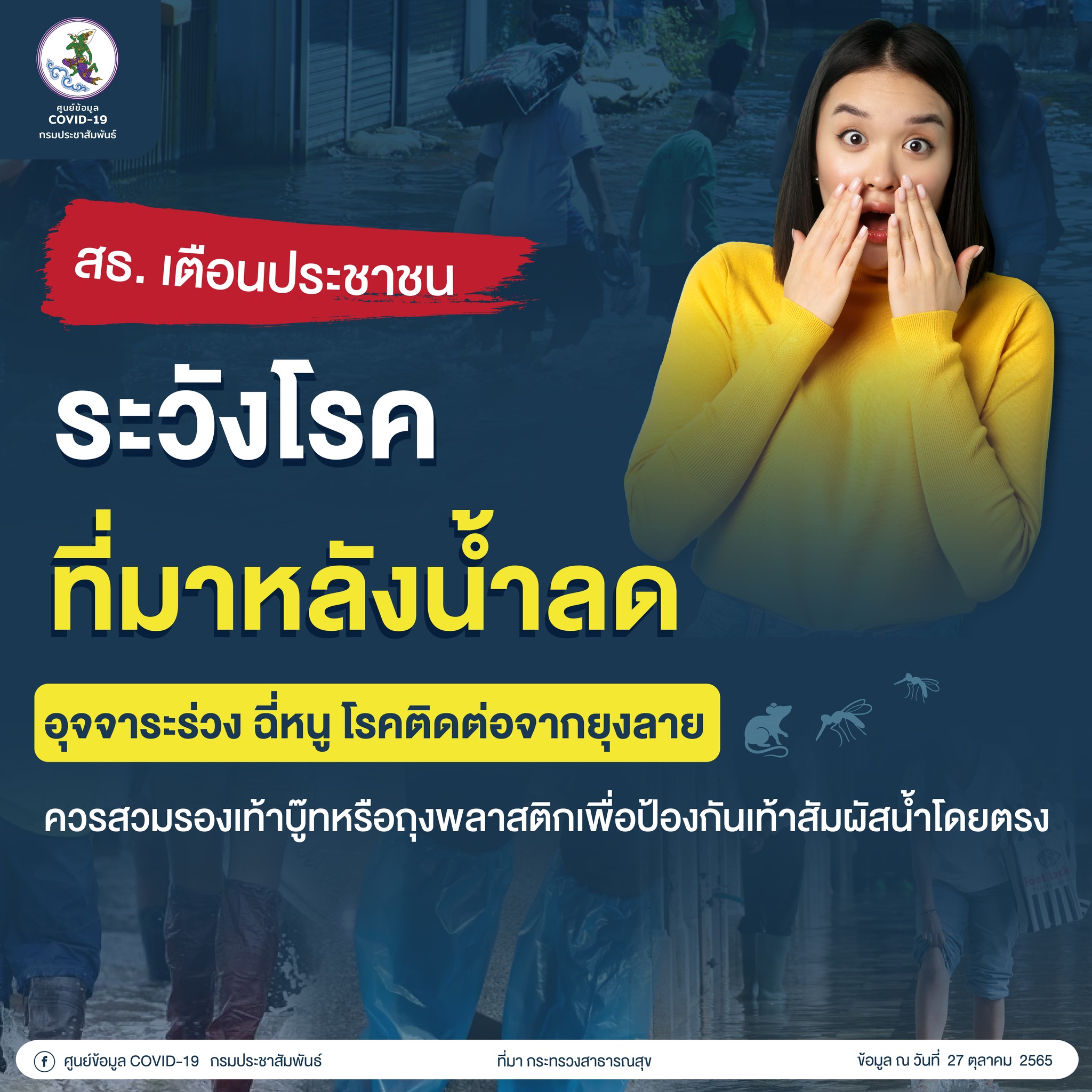 กระทรวงสาธารณสุข เตือนประชาชนระวังโรคที่มาหลังน้ำลด อุจจาระร่วง ฉี่หนู โรคติดต่อจากยุงลาย ควรสวมรองเท้าบู๊ทหรือถุงพลาสติกเพื่อป้องกันเท้าสัมผัสน้ำโดยตรง