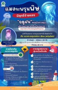 วันนี้ (1 พฤศจิกายน 2565) นายแพทย์ธเรศ กรัษนัยรวิวงค์ รักษาราชการแทนอธิบดีกรมควบคุมโรค กล่าวถึงภัยสุขภาพทางทะเลที่น่าเป็นห่วง คือ อันตรายจากแมงกะพรุนพิษ ซึ่งพบมากในบริเวณชายหาดในช่วงฤดูฝน แมงกะพรุนชนิดที่มีพิษร้ายแรงและอาจทำให้ผู้ที่สัมผัสเสียชีวิตได้อย่างรวดเร็ว คือ แมงกะพรุนกล่อง (Box Jellyfish) ซึ่งมีลักษณะคล้ายกับกล่องสี่เหลี่ยม ลำตัวใส ที่สายหนวดจะมีกระเปาะพิษที่หนวด แบ่งได้เป็น 2 ชนิดใหญ่ๆ คือ ชนิดหนวดเส้นเดียว และชนิดหนวดหลายเส้น เมื่อได้รับพิษจากแมงกะพรุนกล่องสามารถแยกอาการชนิดของหนวดหลายเส้นกับเส้นเดียว โดยชนิดหนวดเส้นเดียว อาจมีอาการปวดหลัง คลื่นไส้ วิตกกังวล มักจะแสดงอาการมากขึ้นเรื่อยๆ แต่อาจไม่ปรากฏรอยไหม้ ซึ่งผู้เสียชีวิตส่วนใหญ่เกิดจากการสัมผัสกับแมงกะพรุนกล่องชนิดที่มีหนวดหลายเส้น อาการของผู้ที่โดนพิษแมงกะพรุนกล่อง มีตั้งแต่ผื่นแดง หรือรอยไหม้ที่ผิวหนัง ปวดแสบปวดร้อนรุนแรง หากได้รับพิษในปริมาณมาก พิษเข้าสู่กระแสเลือดและจะเข้าสู่หัวใจ ทำให้เวียนศีรษะ หัวใจหยุดเต้น ระบบหายใจล้มเหลว อาจเสียชีวิตได้ภายใน 2-10 นาที สถานการณ์ระหว่างปี 2542 – 2564 มีผู้ได้รับบาดเจ็บรุนแรงหรือเสียชีวิตจากแมงกะพรุนกล่อง รวม 48 ราย รายล่าสุดเป็นเด็กหญิงชาวต่างอายุ 6 ปี สงสัยสัมผัสแมงกะพรุนกล่องหลายสาย มีอาการไม่รู้สึกตัว มีบาดแผลเป็นรอยเส้นแดงเป็นเส้นคล้ายตีนตะขาบ แต่สามารถให้การรักษาทันเวลาและช่วยชีวิตไว้ได้ ขณะนี้เดินทางกลับประเทศอย่างปลอดภัย