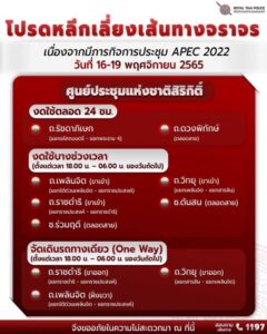 - ในวันที่ 16-19 พ.ย.65 ตั้งแต่เวลา 18.00-06.00 น. ของวันถัดไป **ทั้งนี้สามารถสอบถามข้อมูลเส้นทาง โทร.1197 (บก.02)
