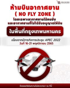 - ตร. ได้ร่วมหารือกับ การบินพลเรือนแห่งประเทศไทย กำหนดเขตพื้นที่ห้ามบินอากาศยานในพื้นที่ กทม. ตั้งแต่วันที่ 16-21 พย 65 (No fly zone)