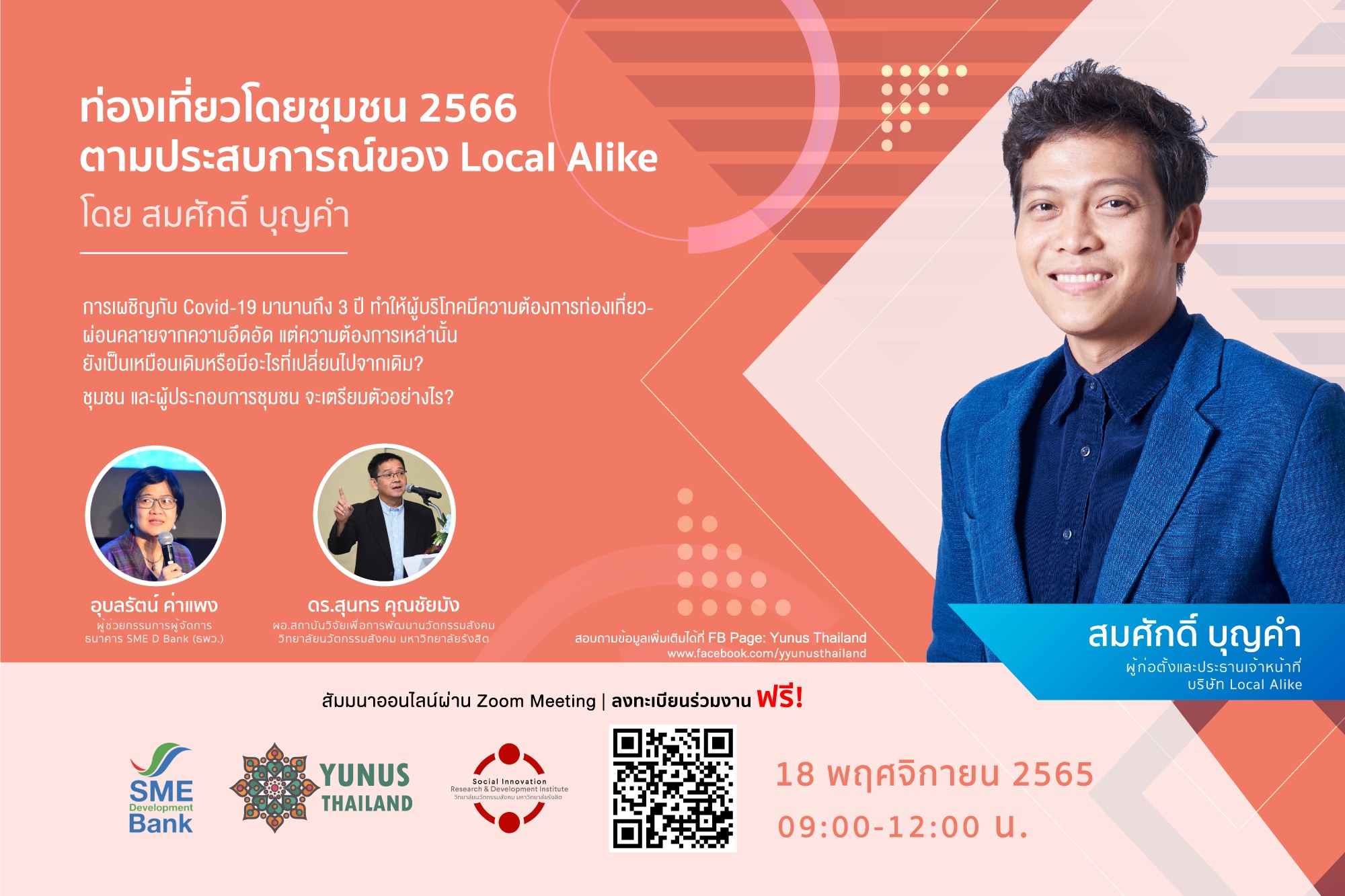 ธนาคารพัฒนาวิสาหกิจขนาดกลางและขนาดย่อมแห่งประเทศไทย ร่วมกับ มูลนิธิยูนุส ประเทศไทย และสถาบันวิจัยเพื่อการพัฒนานวัตกรรมสังคม วิทยาลัยนวัตกรรมสังคม มหาวิทยาลัยรังสิต เชิญร่วมสัมมนาออนไลน์ ความรู้เรื่อง BCG จากผู้ประสบความสำเร็จในการทำธุรกิจอย่างยั่งยืน หัวข้อ “ท่องเที่ยวโดยชุมชน 2566 ตามประสบการณ์ของ Local Alike” โดย สมศักดิ์ บุญคำ วันศุกร์ที่ 18 พฤศจิกายน 2565 เวลา 09.00 – 12.00 น. ผ่าน ZOOM ฟรี