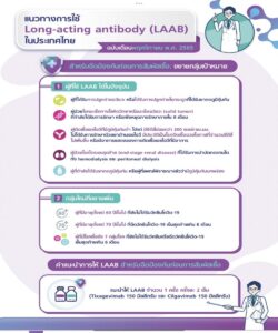 นายแพทย์จินดา โรจนเมธินทร์ ผู้อำนวยการโรงพยาบาลราชวิถี กล่าวเพิ่มเติมว่า ตามมติที่ประชุมคณะทำงานวิชาการและบริหารจัดการ LAAB ในประเทศไทย ครั้งที่ 1/2565 เมื่อวันที่ 4 พฤศจิกายน 2565 ได้กำหนดแนวทางการให้ภูมิคุ้มกันสำเร็จรูป Long-acting antibody หรือ LAAB ในประเทศไทย โดยแบ่งตามกลุ่มเป้าหมาย ดังนี้