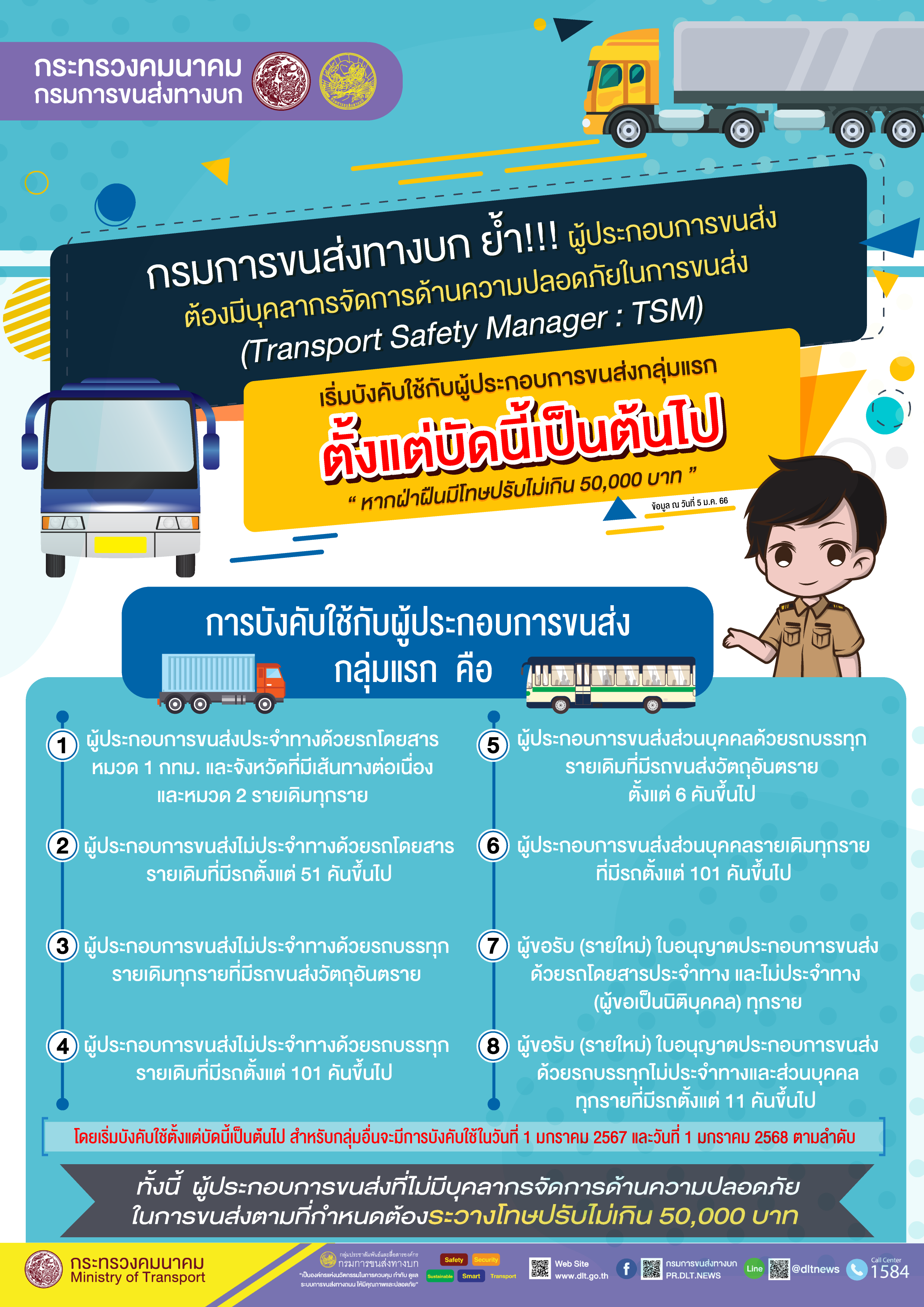 กรมการขนส่งทางบก ย้ำผู้ประกอบการขนส่งต้องมีบุคลากรจัดการด้านความปลอดภัย ในการขนส่ง (Transport Safety Manager : TSM) เริ่มบังคับใช้กับผู้ประกอบการขนส่งกลุ่มแรก ตั้งแต่บัดนี้เป็นต้นไป หากฝ่าฝืนมีโทษปรับไม่เกิน 50,000 บาท