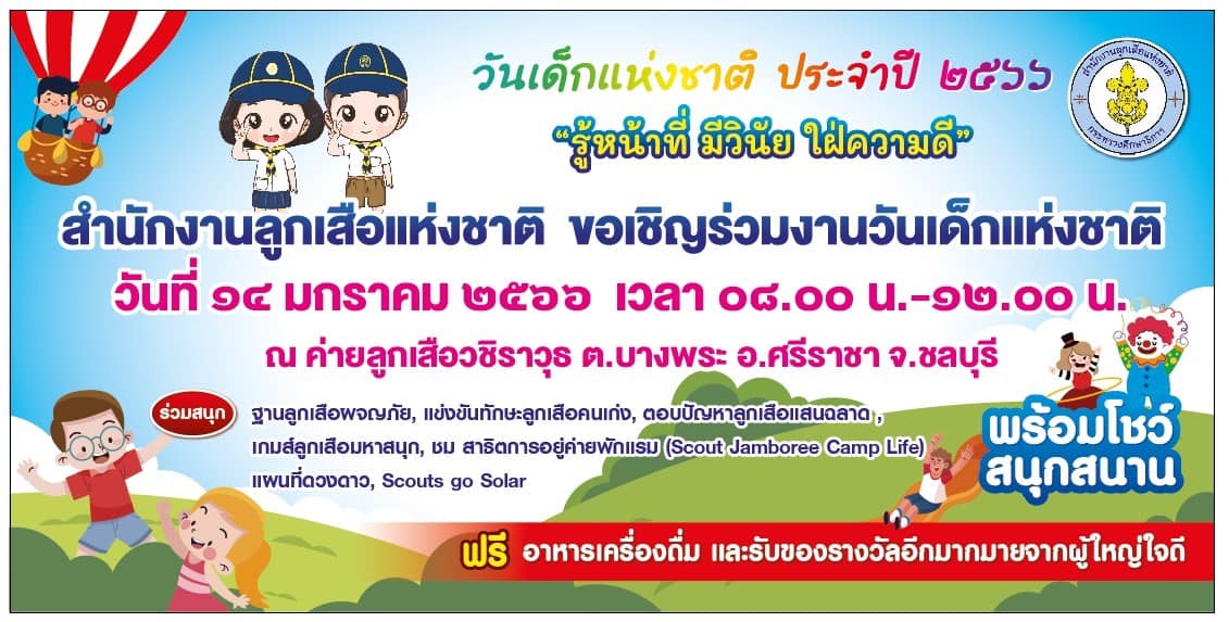 สำนักงานลูกเสือแห่งชาติ ขอเชิญร่วมงานวันเด็กแห่งชาติ ประจำปี 2566 ข่าวสารกิจกรรม สำนักงานลูกเสือแห่งชาติ ขอเชิญร่วมงานวันเด็กแห่งชาติ ประจำปี 2566 สำนักงานลูกเสือแห่งชาติ ขอเชิญร่วมงานวันเด็กแห่งชาติ ประจำปี 2566 วันเสาร์ที่ 14 มกราคม 2566 เวลา 08.00 – 12.00 น. ณ ค่ายลูกเสือวชิราวุธ ตำบลบางพระ อำเภอศรีราชา จังหวัดชลบุรี พร้อมร่วมสนุก ฐานลูกเสือผจญภัย , แข่งขันทักษะลูกเสือคนเก่ง , ตอบปัญหาลูกเสือแสนฉลาด , เกมส์ลูกเสือมหาสนุก ชม สาธิตการอยู่ค่ายพักแรม (Scout Jamboree Camp Life) ,แผนที่ดวงดาว , Scouts go solar พร้อมโชว์สนุกสนานที่มา : https://bit.ly/3WTJmDF Post Views: 373 FacebookFacebookXTwitterLINELine