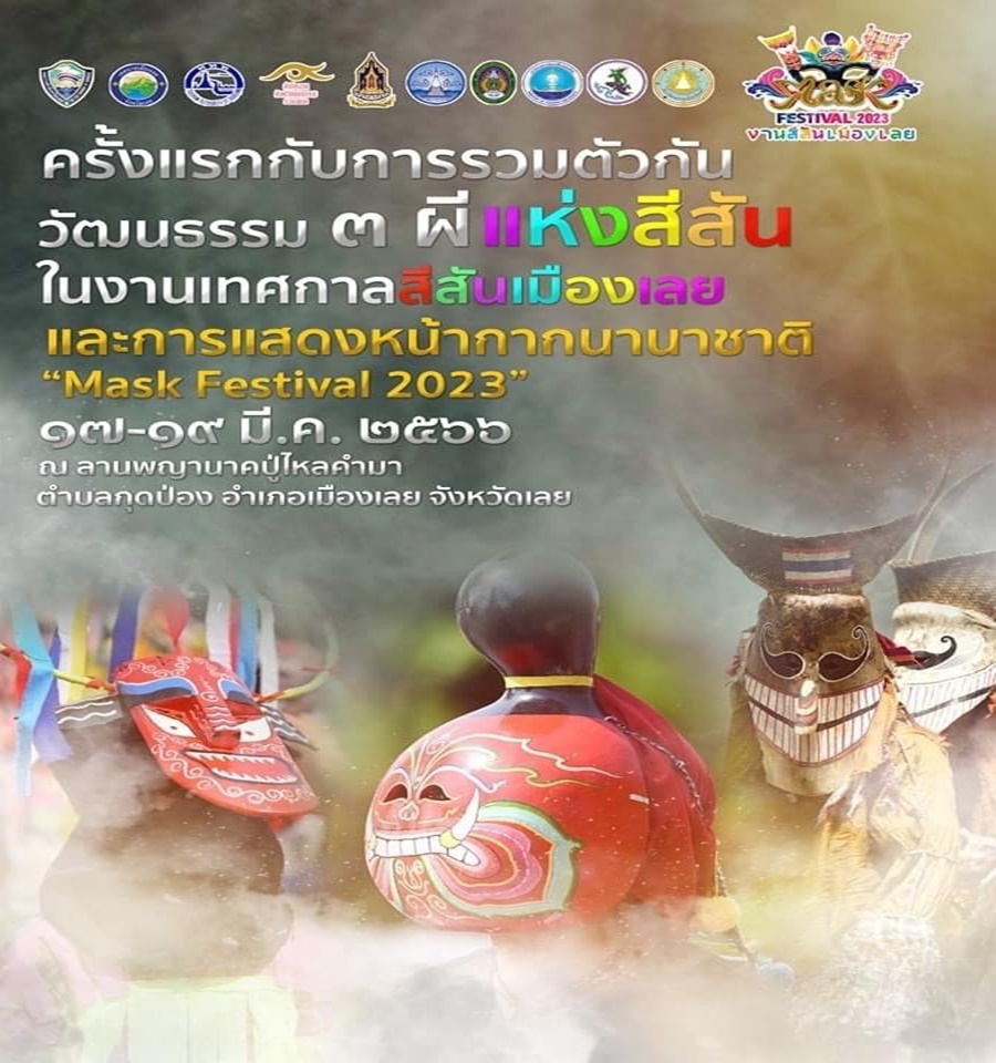 กระทรวงวัฒนธรรม โดย สำนักงานศิลปวัฒนธรรมร่วมสมัย ร่วมกับจังหวัดเลย สำนักงานวัฒนธรรมจังหวัด เทศบาลเมือง มหาวิทยาลัยราชภัฎ หอการค้าจังหวัด สภาวัฒนธรรมจังหวัด การท่องเที่ยวแห่งประเทศไทย พร้อมด้วยองค์กรเครือข่าย ขอเชิญทุกท่านร่วมงานเทศกาลสีสันเมืองเลย และการแสดงหน้ากากนานาชาติ “Mask Festival 2023” ครั้งยิ่งใหญ่ ระหว่างวันที่ 17 – 19 มีนาคม 2566 ณ บริเวณลานพญานาค สวนสาธารณะกุดป่อง อำเภอเมืองเลย จังหวัดเลย โดยพิธีเปิดจัดขึ้นในวันศุกร์ที่ 17 มีนาคม 2566 เวลา 18.00 น. ณ บริเวณลานพญานาค สวนสาธารณะกุดป่อง อำเภอเมืองเลย จังหวัดเลย