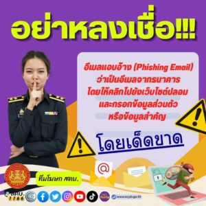 สำนักงานคณะกรรมการคุ้มครองผู้บริโภค แนะนำอย่าหลงเชื่ออีเมลแอบอ้างว่าเป็นอีเมลจากธนาคาร โดยให้คลิกไปยังเว็บไซต์ปลอมและกรอกข้อมูลส่วนตัวหรือข้อมูลสำคัญ