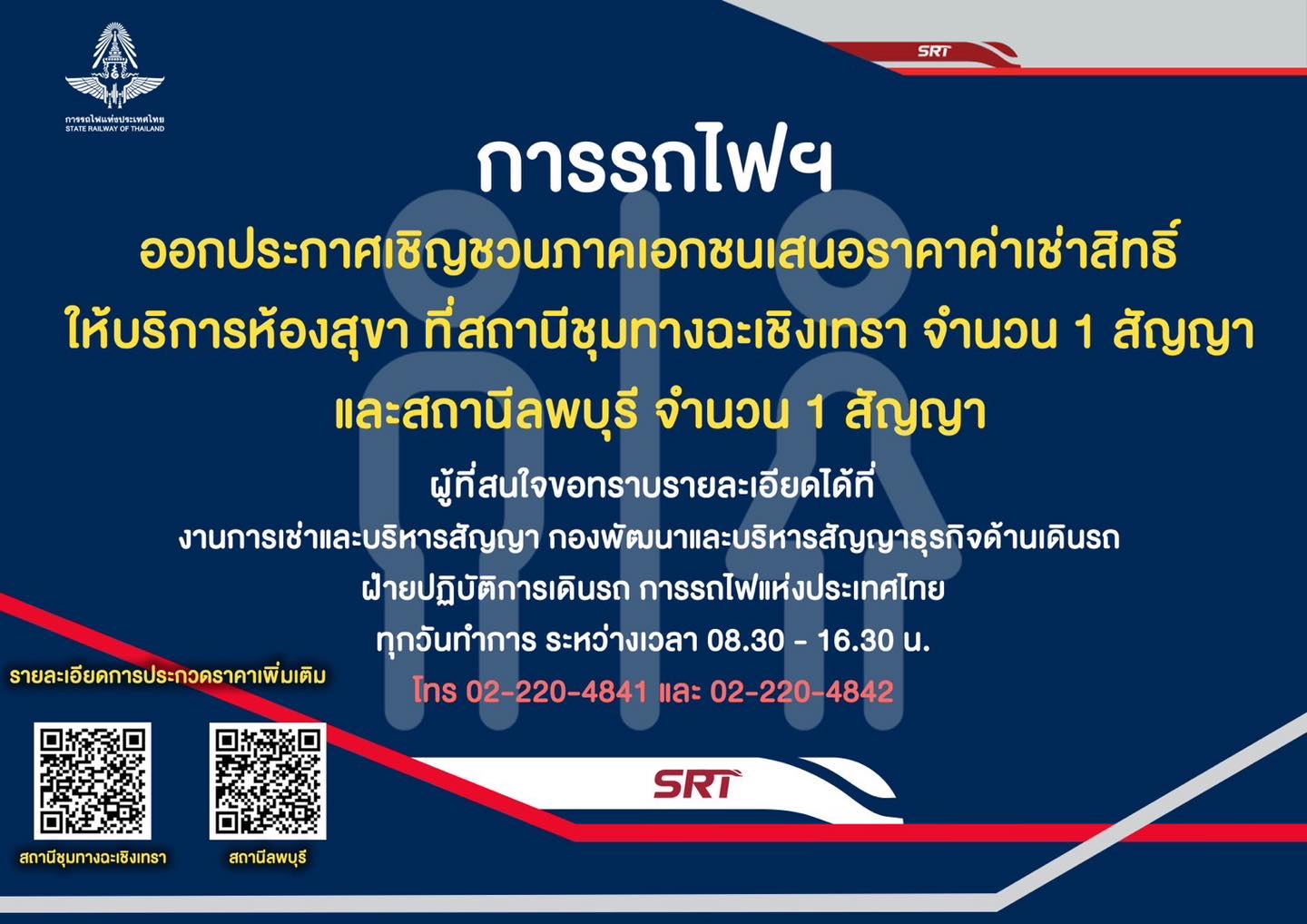 การรถไฟแห่งประเทศไทย เชิญชวนเสนอราคาค่าเช่าสิทธิ์ให้บริการห้องสุขา ที่สถานีชุมทางฉะเชิงเทราและสถานีลพบุรี