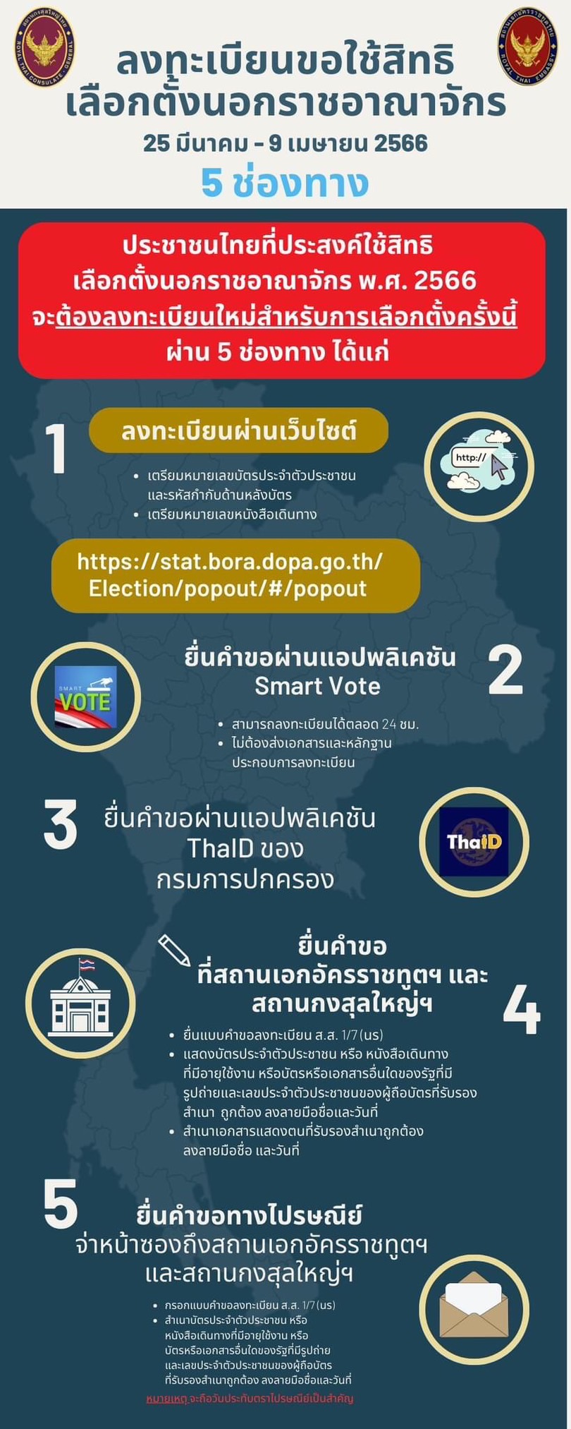 ช่องทางการลงทะเบียนขอใช้สิทธิเลือกตั้งล่วงหน้านอกราชอาณาจักร