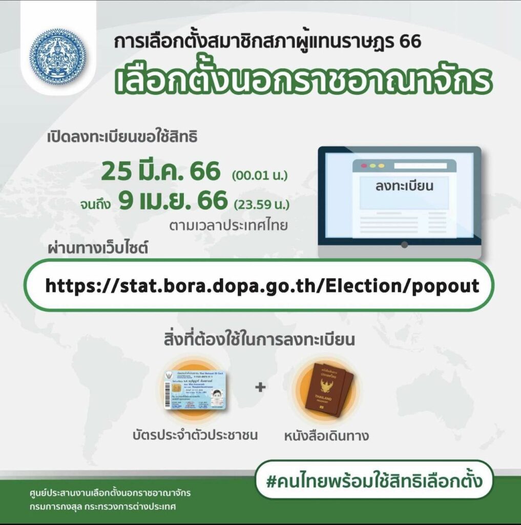 - สำนักงานคณะกรรมการการเลือกตั้งได้ประกาศกำหนดให้วันที่ 25 มีนาคม 2566 ถึงวันที่ 9 เมษายน 2566 เป็นวันลงทะเบียนขอใช้สิทธิเลือกตั้งล่วงหน้านอกเขตเลือกตั้งและนอกราชอาณาจักร โดยสามารถลงทะเบียนขอใช้สิทธิออกเสียงลงคะแนนก่อนวันเลือกตั้งต่อนายทะเบียนอำเภอหรือนายทะเบียนท้องถิ่นที่ตนมีสิทธิเลือกตั้ง หรือที่ตนประสงค์จะขอใช้สิทธิเลือกตั้งก็ได้
