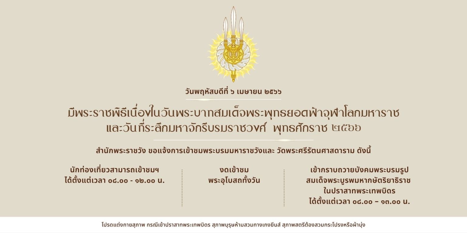 สำนักพระราชวัง แจ้งการเข้าชมพระบรมมหาราชวังและวัดพระศรีรัตนศาสดาราม ในวันพฤหัสบดีที่ 6 เมษายน 2566 เนื่องในพระราชพิธีวันพระบาทสมเด็จพระพุทธยอดฟ้าจุฬาโลกมหาราชและวันที่ระลึกมหาจักรีบรมราชวงศ์