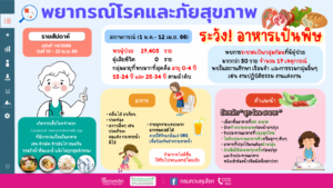 “การพยากรณ์โรคและภัยสุขภาพของสัปดาห์นี้คาดว่าจะพบผู้ป่วยโรคอาหารเป็นพิษสูงต่อเนื่อง ผนวกกับช่วงนี้ประเทศไทยที่มีอากาศที่ร้อนจัด ส่งผลให้อาหารต่างๆ บูดเร็ว อาจมีสารพิษและแบคทีเรียปนเปื้อน โดยผู้ป่วยโรคอาหารเป็นพิษ จะมีอาการคลื่นไส้ อาเจียน ปวดท้อง ถ่ายอุจจาระเหลว ถ่ายเป็นน้ำหรือมีมูกเลือด ร่วมกับอาการอื่นๆ เช่น ปวดศีรษะ คอแห้งกระหายน้ำ และอาจมีไข้ได้ ซึ่งถ้าหากอาการรุนแรงขึ้น มีเชื้อโรคปนเปื้อนเข้าไปในกระแสเลือด ก็อาจจะเป็นอันตรายถึงชีวิตได้ ส่วนใหญ่มักเกิดการระบาดเป็นกลุ่มก้อน ในกลุ่มคนที่มีการรับประทานอาหารและน้ำร่วมกัน สำหรับการช่วยเหลือเบื้องต้นควรให้จิบสารละลายเกลือแร่ โอ อาร์ เอส บ่อยๆ เพื่อป้องกันไม่ให้ร่างกายขาดน้ำ ถ้าอาการไม่ดีขึ้นให้รีบไปพบแพทย์โดยเร็ว