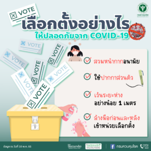 กรมควบคุมโรค แนะนำประชาชนที่ไปใช้สิทธิเลือกตั้งปฏิบัติตามมาตรการป้องกันโรคโควิด 19 อย่างเคร่งครัด คือ สวมหน้ากากอนามัย ล้างมือ ใช้ปากกาส่วนตัว (หากมี) และเว้นระยะห่าง เพื่อป้องกันการติดเชื้อ และขอเชิญชวนประชาชนโดยเฉพาะกลุ่มเสี่ยง เข้ารับวัคซีนคู่สู้หน้าฝน (Dual Immunity) เพื่อป้องกันโรคไข้หวัดใหญ่ควบคู่กับวัคซีนโควิด 19 เข็มกระตุ้น เนื่องจากประเทศไทยกำลังจะเข้าสู่ฤดูฝน อาจมีการแพร่ระบาดเพิ่มขึ้น ซึ่งการฉีดวัคซีนจะทำให้ลดอาการป่วยหนักและป้องกันเสียชีวิตได้