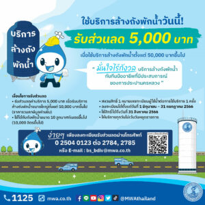 การประปานครหลวง มอบส่วนลด 5,000 บาท เมื่อใช้บริการล้างถังพักน้ำขนาดใหญ่ (ถังพักน้ำขนาด 10 ลูกบาศก์เมตร ขึ้นไป)