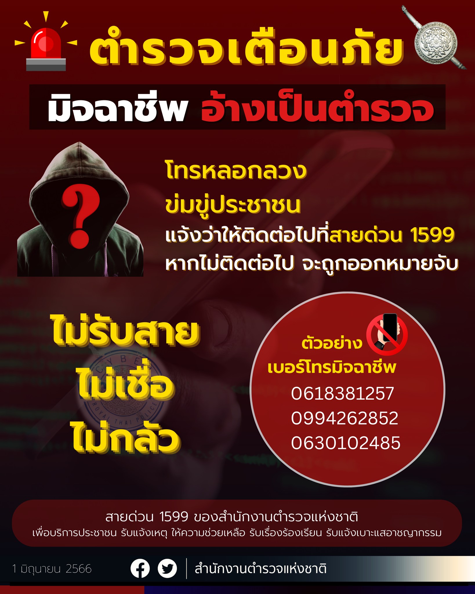 สำนักงานตำรวจแห่งชาติ เตือนมิจฉาชีพอ้างตัวเป็นเจ้าหน้าที่ตำรวจ โทรศัพท์ไปหลอกลวง ก่อกวน ข่มขู่ประชาชน แจ้งว่าให้ติดต่อไปที่เบอร์โทรสายด่วน 1599 ( สายด่วนสำนักงานตำรวจแห่งชาติ ) หากไม่ติดต่อไป จะถูกออกหมายจับ