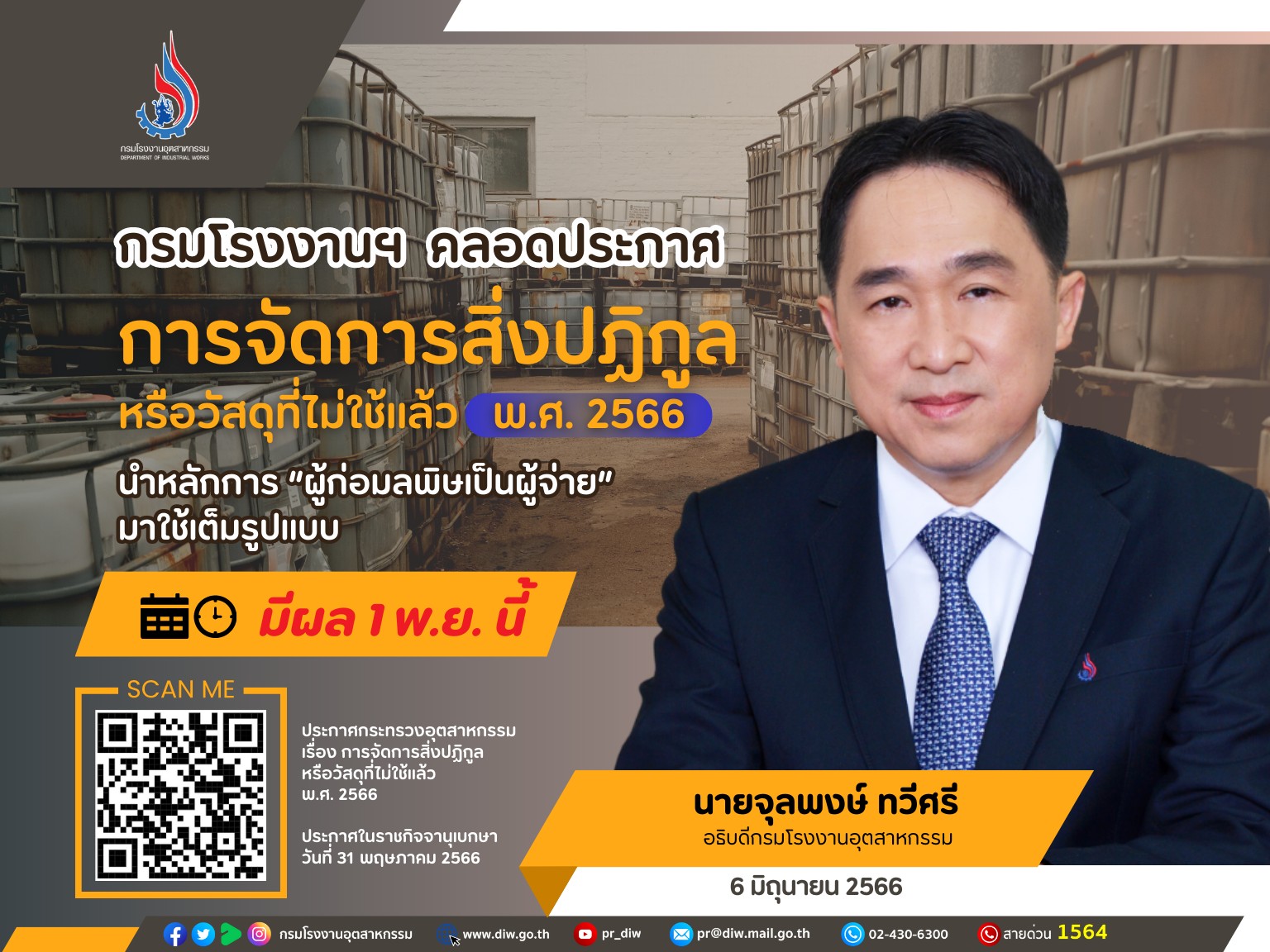 นายจุลพงษ์ ทวีศรี อธิบดีกรมโรงงานอุตสาหกรรม เปิดเผยว่า กระทรวงอุตสาหกรรม โดย กรมโรงงานอุตสาหกรรม (กรอ.) ให้ความสำคัญต่อการบริหารจัดการสิ่งปฏิกูลหรือวัสดุที่ไม่ใช้แล้วที่เกิดขึ้นจากการประกอบกิจการโรงงาน จึงได้ปรับปรุงประกาศฉบับล่าสุด “ประกาศกระทรวงอุตสาหกรรม เรื่อง การจัดการสิ่งปฏิกูลหรือวัสดุที่ไม่ใช้แล้ว พ.ศ. 2566” ที่นำหลักการผู้ก่อมลพิษเป็นผู้จ่ายหรือเป็นผู้รับผิดชอบ (Polluter Pays Principle: PPP) มาใช้อย่างเต็มรูปแบบ กำหนดความรับผิดตั้งแต่ต้นทางโรงงานผู้ก่อกำเนิด ไปจนกว่าสิ่งปฏิกูลหรือวัสดุที่ไม่ใช้แล้วจะได้รับการจัดการจนแล้วเสร็จ ต่างจากเดิมที่ความรับผิดชอบจะสิ้นสุดเมื่อโรงงานผู้รับกำจัดได้รับมอบสิ่งปฏิกูลหรือวัสดุที่ไม่ใช้แล้ว โดยมีผลบังคับใช้ตั้งแต่วันที่ 1 พฤศจิกายน 2566 ยกเว้น การส่งรายงานประจำปีเกี่ยวกับการจัดการสิ่งปฏิกูลหรือวัสดุที่ไม่ใช้แล้ว และรายงานประจำเดือนเกี่ยวกับการจัดการวัตถุดิบและผลิตภัณฑ์ ผ่านระบบการรายงานข้อมูลกลางของกระทรวงอุตสาหกรรม หรือ iSingle Form (https://isingleform.go.th/home) ซึ่งประกาศในราชกิจจานุเบกษา เมื่อวันที่ 31 พฤษภาคม 2566 และจะมีผลนับถัดจากวันที่ประกาศ ฝ่าฝืนไม่รายงานหรือรายงานล่าช้ามีโทษปรับสุงสุด 20,000 บาท