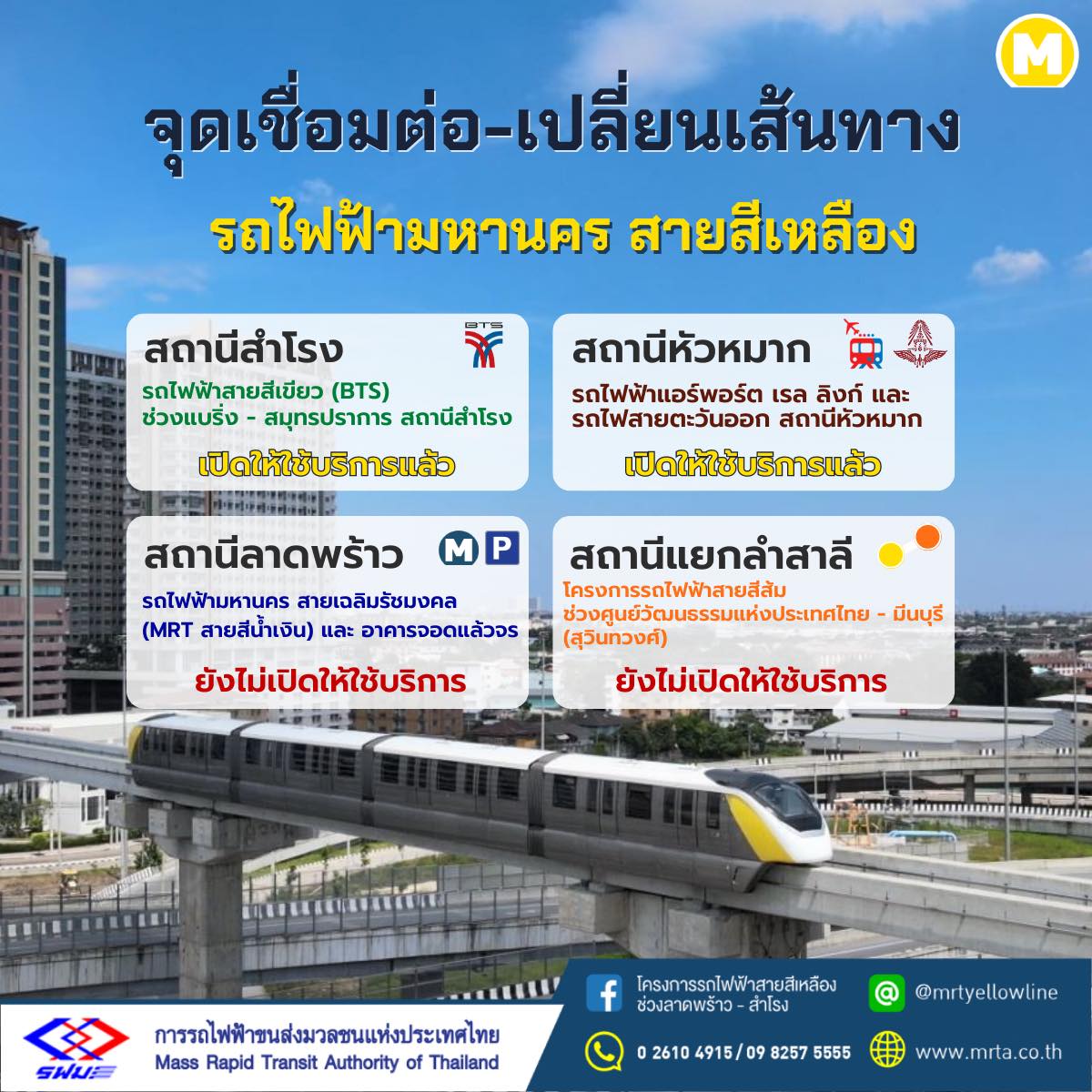 การรถไฟฟ้าขนส่งมวลชนแห่งประเทศไทย เปิดเผยผู้ใช้บริการ สอบถามเรื่องจุดเชื่อมต่อเข้ามาเป็นจำนวนมาก จึงขอแนะนำโครงการรถไฟฟ้าสายสีเหลือง มีจุดเชื่อมต่อทั้งหมด 4 จุด ซึ่งมีสถานีจุดเชื่อมต่อ 2 สถานีที่เปิดใช้บริการแล้ว ได้แก่