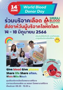 ขอเชิญทุกท่านที่มีสุขภาพดี ร่วมกันบริจาคเลือด ณ ศูนย์รับบริจาคเลือดศิริราช พร้อมรับเสื้อยืดที่ระลึก “World Blood Donor Day 2023” ในสัปดาห์วันผู้บริจาคโลหิตโลก 2566