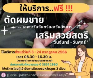 เปิดให้บริการตั้งแต่วันที่ 3 – 24 กรกฎาคม 2566 เวลา 08.30-16.30 น. (หยุดเสาร์-อาทิตย์และวันนักขัตฤกษ์) ผู้สนใจเข้ารับบริการได้ที่แผนกเสริมสวยสตรี และแผนกตัดผมชาย ศูนย์เรียนรู้การพัฒนาสตรีและครอบครัวฯ จังหวัดชลบุรี