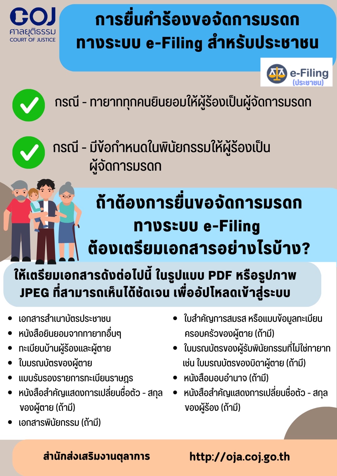 ในส่วนของสำนักงานศาลยุติธรรมได้นำระบบการรับส่งคำร้องทางอิเล็กทรอนิกส์ หรือ ระบบ e-Filing มากให้บริการคู่ความและผู้เกี่ยวข้อง โดยพัฒนาระบบสู่เวอร์ชั่นที่3 และระบบล่าสุดนี้ได้รองรับบริการให้ประชาชนทั่วไป(ไม่ใช่ทนายความ) ซึ่งเป็นทายาทของเจ้ามรดกสามารถยื่นคำร้องขอจัดการมรดกได้ด้วยตนเองได้ใน 2 กรณี คือ 1.ทายาททุกคนยินยอมให้ผู้ร้องนั้นเป็นผู้จัดการมรดก (ไม่มีการคัดค้าน) 2.มีข้อกำหนดในพินัยกรรมให้ผู้ร้องนั้นเป็นผู้จัดการมรดก