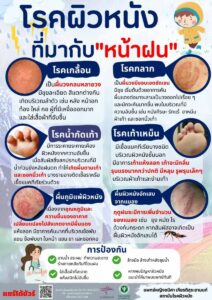 สถาบันโรคผิวหนัง เตือนประชาชนในช่วงหน้าฝนให้ระมัดระวัง โรคผิวหนังที่มากับหน้าฝน โดยในฤดูฝนเป็นช่วงที่มีน้ำท่วมขัง สภาพอากาศชื้น และเป็นปัจจัยสำคัญที่ส่งผลต่อการเกิดโรคผิวหนังต่างๆ หมั่นสังเกตตนเองอยู่เสมอ หากมีอาการผิดปกติที่ผิวหนัง ส่วนใหญ่จะเกิดจากเชื้อราหรือเเบคทีเรีย ที่จะเจริญเติบโตเเละก่อโรคได้ดีในสภาพอากาศเเละสิ่งเเวดล้อมในฤดูฝน ประชาชนที่เดินทางออกนอกบ้าน บางครั้งอาจจะเปียกฝนหรือเดินลุยน้ำขัง จะพบปัญหาโรคผิวหนังที่ตามมา จึงควรหมั่นสังเกตตนเองอยู่เสมอ หากมีอาการผิดปกติทางผิวหนัง แนะนำให้มาปรึกษาแพทย์ผู้เชี่ยวชาญเพื่อรับการวินิจฉัยเเละดูเเลรักษาที่ถูกต้องต่อไป