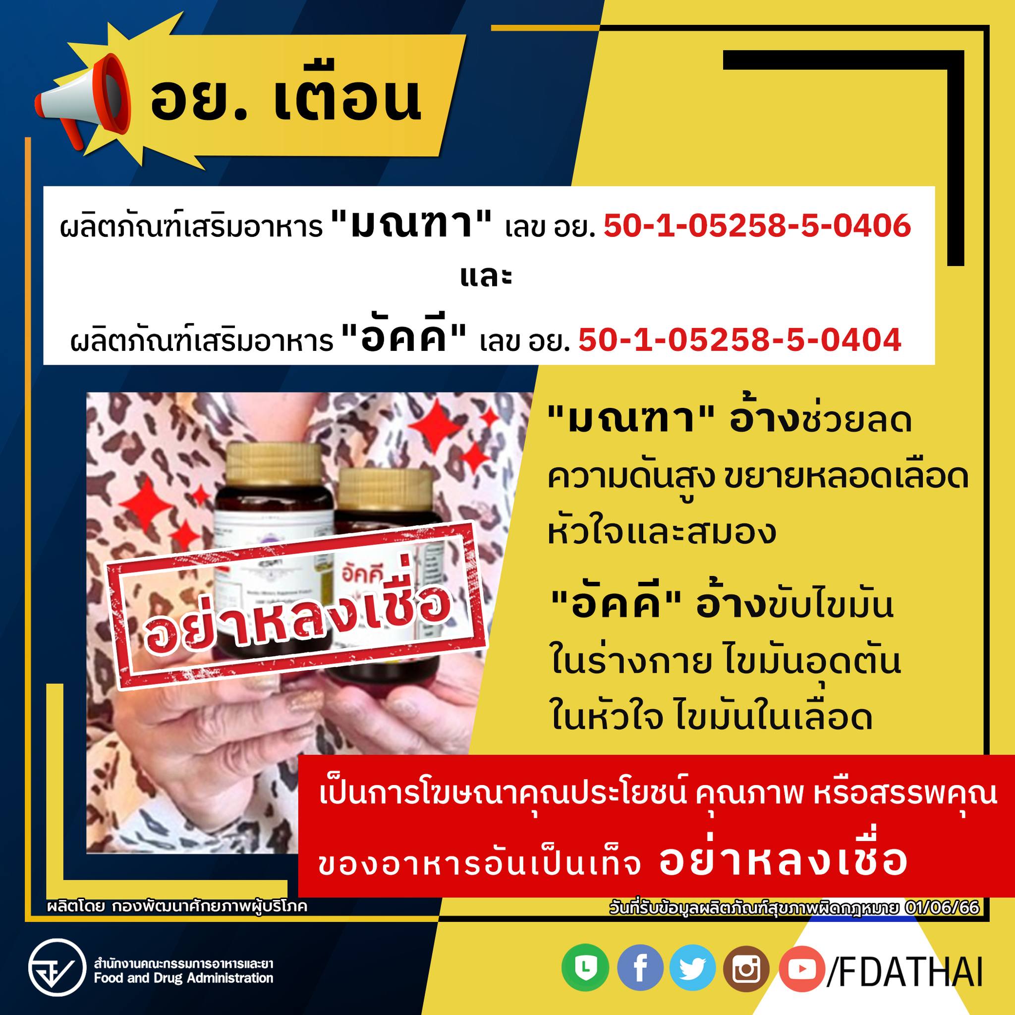 อย. เตือนผลิตภัณฑ์เสริมอาหาร มณฑา Montha (Dietary Supplement Product) เลขอย. 50-1-052585-0406 และอัคคี Aukkee (Dietary Supplement Product) เลขอย. 50-1-05258-5-0404 โฆษณากล่าวอ้างสรรพคุณ “มณฑา” ช่วยเรื่อง ลดความดันสูง ขยายหลอดเลือดหัวใจ และสมอง “อัคคี” ช่วยเรื่อง ขับไขมันในร่างกาย ไขมันอุดตันในหัวใจ ไขมันในเลือด และ “ทานคู่กันสามารถป้องกัน เส้นเลือดตีบ แขนขาอ่อนแรง และเป็นยาอายุวัฒนะ” อย. ตรวจสอบแล้ว เป็นการโฆษณาคุณประโยชน์ คุณภาพ หรือสรรพคุณของอาหารอันเป็นเท็จ หรือหลอกลวง ให้เกิดความหลงเชื่อโดยไม่สมควร เตือนประชาชนอย่าหลงเชื่อ และไม่แนะนำให้ใช้ผลิตภัณฑ์เสริมอาหารดังกล่าว