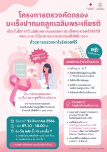 โรงพยาบาลจุฬาลงกรณ์ สภากาชาดไทย จัดโครงการตรวจคัดกรองมะเร็งปากมดลูกเฉลิมพระเกียรติ เนื่องในโอกาสวันเฉลิมพระชนมพรรษาสมเด็จพระนางเจ้าสิริกิติ์ พระบรมราชินีนาถ พระบรมราชชนนีพันปีหลวง วันแม่แห่งชาติ 12 สิงหาคม 2566 โดยไม่คิดค่าใช้จ่าย จำนวน 400 ราย สำหรับสตรีที่มีเกณฑ์การเข้าร่วมโครงการฯ ดังนี้