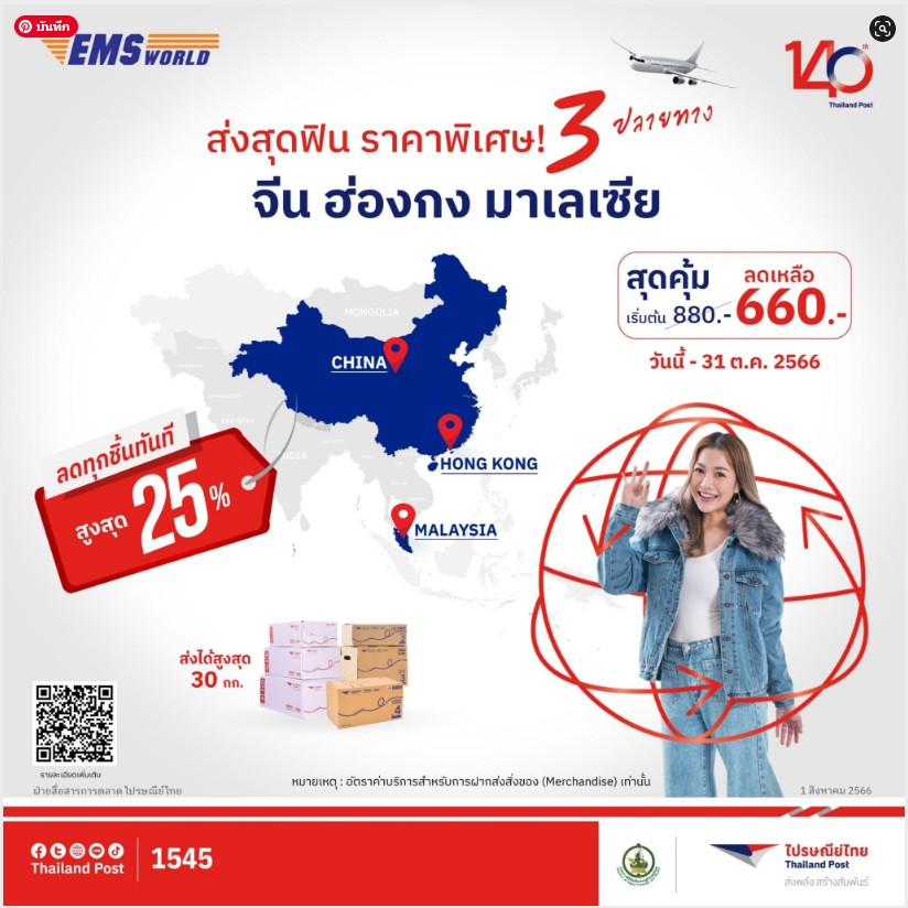 ไปรษณีย์ไทย จัดโปรโมชันสำหรับฝากส่งสินค้าประเภทสิ่งของ (Merchandise) ด้วยบริการ EMS World ในราคาพิเศษลดสูงสุดถึง 25% ทุกพิกัดน้ำหนัก เริ่มต้น 660 บาท (สำหรับสิ่งของน้ำหนักไม่เกิน 250 กรัม) ไปยังปลายทางจีน ฮ่องกง มาเลเซีย ส่งได้สูงสุดถึง 30 กิโลกรัม ตั้งแต่วันที่ 1 สิงหาคม – 31 ตุลาคม 2566 ที่ไปรษณีย์ทั่วประเทศ