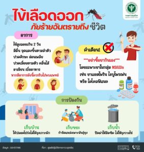 ทั้งนี้ ขอให้ประชาชนป้องกันตนเองไม่ให้ถูกยุงกัดโดยการทายากันยุง หรือนอนในมุ้ง และหากประชาชนมีอาการไข้สูงลอย ร่วมกับอาการปวดศีรษะ ปวดกระบอกตา หน้าแดง กระหายน้ำ หรือมีจุดเลือดออกที่ลำตัว และแขน ขา ไม่ควรซื้อยามารับประทานเอง โดยเฉพาะยาลดไข้ในกลุ่มเอ็นเสด (NSAIDs) เช่น ไอบูโพรเฟน ไดโครฟีแนก แอสไพริน รวมถึงยาชุด มีผลทำให้เลือดออกในทางเดินอาหารและยากต่อการรักษา เสี่ยงต่อการเสียชีวิต หรือรับประทานยาหรือเช็ดตัวแล้วไข้ไม่ลด หรือลดแล้วไข้กลับมาสูงอีก ควรรีบไปพบแพทย์ ซึ่งโรคไข้เลือดออกหากได้รับการรักษาล่าช้า จะเสี่ยงต่อการเสียชีวิต หากสงสัยสอบถามข้อมูลเพิ่มเติม ที่สายด่วนกรมควบคุมโรค โทร. 1422
