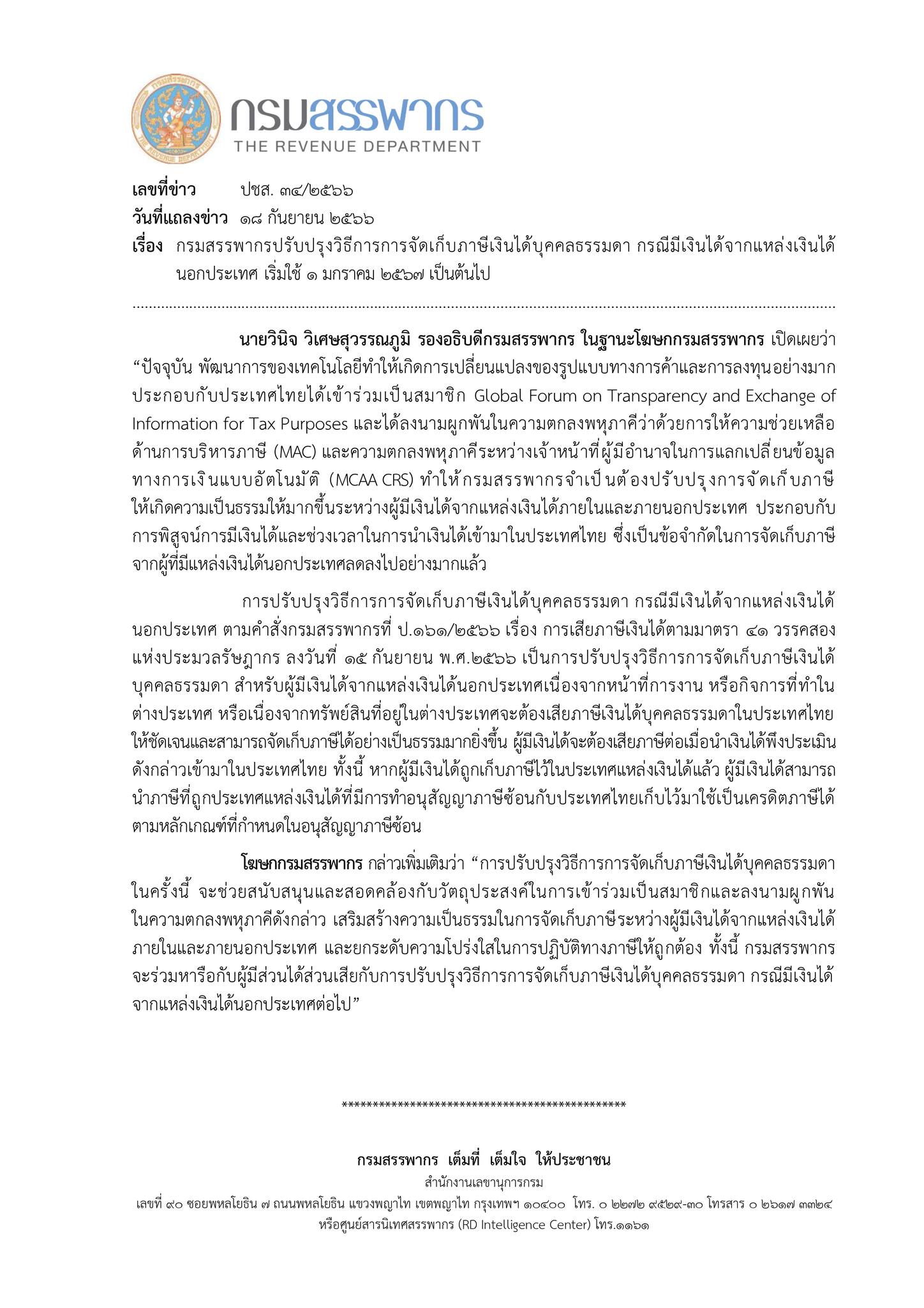 โฆษกกรมสรรพากร กล่าวเพิ่มเติมว่า “การปรับปรุงวิธีการการจัดเก็บภาษีเงินได้บุคคลธรรมดาในครั้งนี้ จะช่วยสนับสนุนและสอดคล้องกับวัตถุประสงค์ในการเข้าร่วมเป็นสมาชิกและลงนามผูกพันในความตกลงพหุภาคีดังกล่าว เสริมสร้างความเป็นธรรมในการจัดเก็บภาษีระหว่างผู้มีเงินได้จากแหล่งเงินได้ภายในและภายนอกประเทศ และยกระดับความโปร่งใสในการปฏิบัติทางภาษีให้ถูกต้อง ทั้งนี้ กรมสรรพากร จะร่วมหารือกับผู้มีส่วนได้ส่วนเสียกับการปรับปรุงวิธีการการจัดเก็บภาษีเงินได้บุคคลธรรมดา กรณีมีเงินได้จากแหล่งเงินได้นอกประเทศต่อไป”