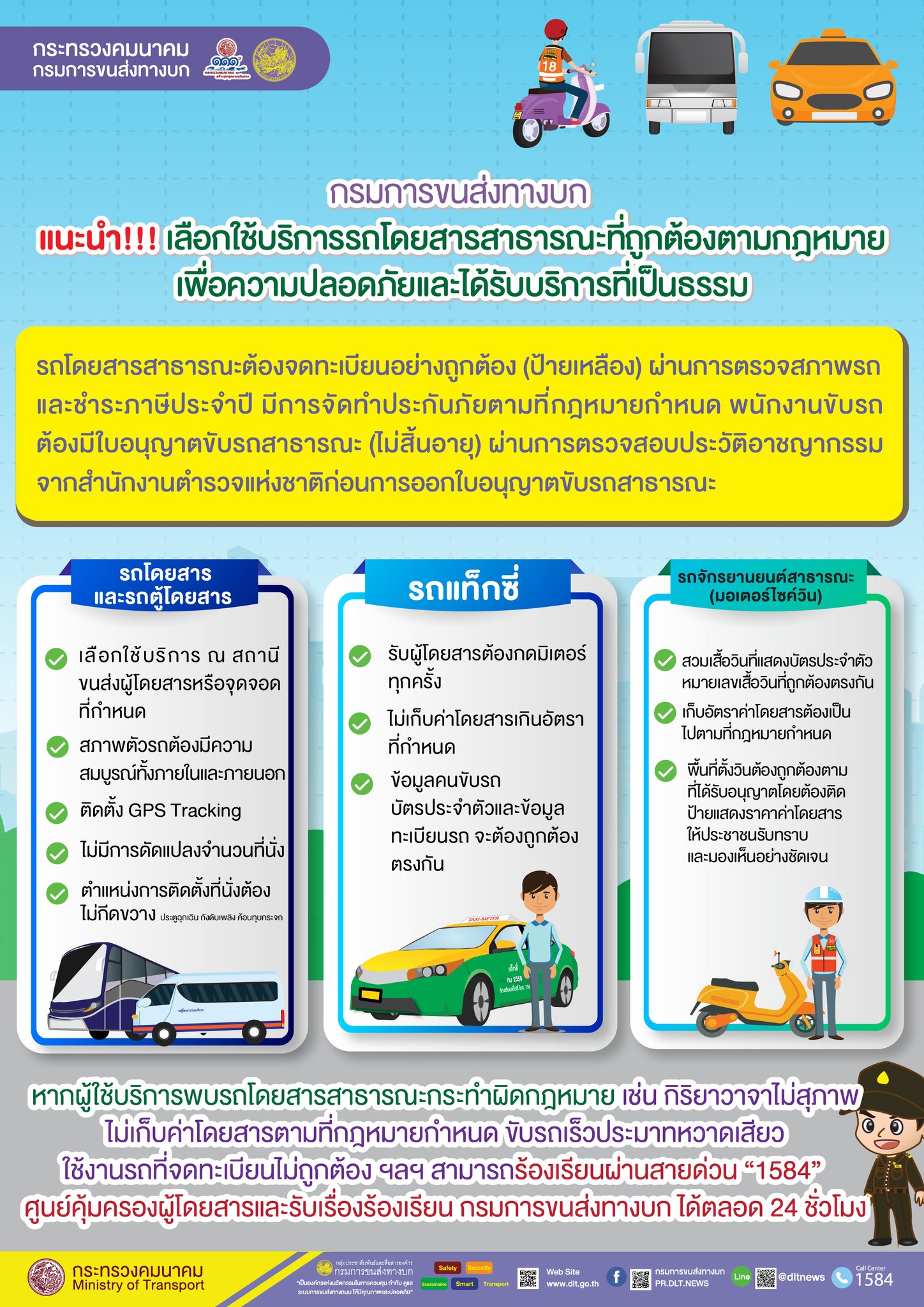 นายเสกสม อัครพันธุ์ รองอธิบดีกรมการขนส่งทางบก เปิดเผยว่า ณ ปัจจุบันอุบัติเหตุทางถนน เป็นปัญหาสำคัญของประเทศไทยโดยเฉพาะอุบัติเหตุที่เกิดขึ้นกับรถโดยสารสาธารณะเนื่องจากในแต่ละเที่ยวของการเดินทางมีการบรรทุกผู้โดยสารเป็นกลุ่มหรือหมู่คณะ ทำให้เกิดความเสียหายต่อชีวิตและทรัพย์สินของประชาชน กรมการขนส่งทางบก แนะนำประชาชนเลือกใช้บริการจากรถโดยสารสาธารณะที่ถูกต้องตามกฎหมายเพื่อความปลอดภัย และได้รับบริการที่เป็นธรรม ทั้งนี้ รถโดยสารสาธารณะต้องจดทะเบียนอย่างถูกต้อง (ป้ายเหลือง) ผ่านการตรวจสภาพรถและชำระภาษีประจำปี มีการจัดทำประกันภัยตามที่กฎหมายกำหนด พนักงานขับรถต้องมีใบอนุญาตขับรถสาธารณะ (ไม่สิ้นอายุ) ผ่านการตรวจสอบประวัติอาชญากรรมจากสำนักงานตำรวจแห่งชาติก่อนการออกใบอนุญาตขับรถสาธารณะ รถโดยสารและรถตู้โดยสาร ต้องเลือกใช้บริการ ณ สถานีขนส่งผู้โดยสารหรือจุดจอดที่กำหนด เพื่อป้องกันกลุ่มคนฉวยโอกาสนำรถที่ไม่ได้รับอนุญาตมาให้บริการ และสภาพตัวรถต้องมีความสมบูรณ์ทั้งภายในและภายนอก ระบบเบรก สภาพยางและล้อ ต้องอยู่ในสภาพสมบูรณ์พร้อมใช้งาน มีการติดตั้ง GPS Tracking และอุปกรณ์เพื่อความปลอดภัยครบถ้วน ได้แก่ การติดตั้งเข็มขัดนิรภัยครบทุกที่นั่งและสามารถใช้งานได้ ไม่มีการดัดแปลงจำนวนที่นั่ง ตำแหน่งการติดตั้งที่นั่งต้องไม่กีดขวางประตูฉุกเฉิน ถังดับเพลิง ค้อนทุบกระจก เป็นต้น รถแท็กซี่ เมื่อรับผู้โดยสารต้องกดมิเตอร์ทุกครั้งและไม่เก็บค่าโดยสารเกินอัตราที่กำหนด ข้อมูลคนขับรถ บัตรประจำตัวและข้อมูลทะเบียนรถ จะต้องถูกต้องตรงกัน รถจักรยานยนต์สาธารณะ (มอเตอร์ไซค์วิน) ต้องแต่งกายตามที่ทางราชการกำหนด สวมเสื้อวินที่แสดงบัตรประจำตัว หมายเลขเสื้อวินที่ถูกต้องตรงกัน การเก็บอัตราค่าโดยสารต้องเป็นไปตามที่กฎหมายกำหนด โดยต้องติดตั้งป้ายแสดงราคาค่าโดยสารให้ประชาชนรับทราบและมองเห็นอย่างชัดเจนในบริเวณที่ตั้งวิน และพื้นที่ตั้งวินต้องถูกต้องตามที่ได้รับอนุญาตและมีการให้บริการในเส้นทางหรือพื้นที่ที่ได้รับอนุญาตเท่านั้น