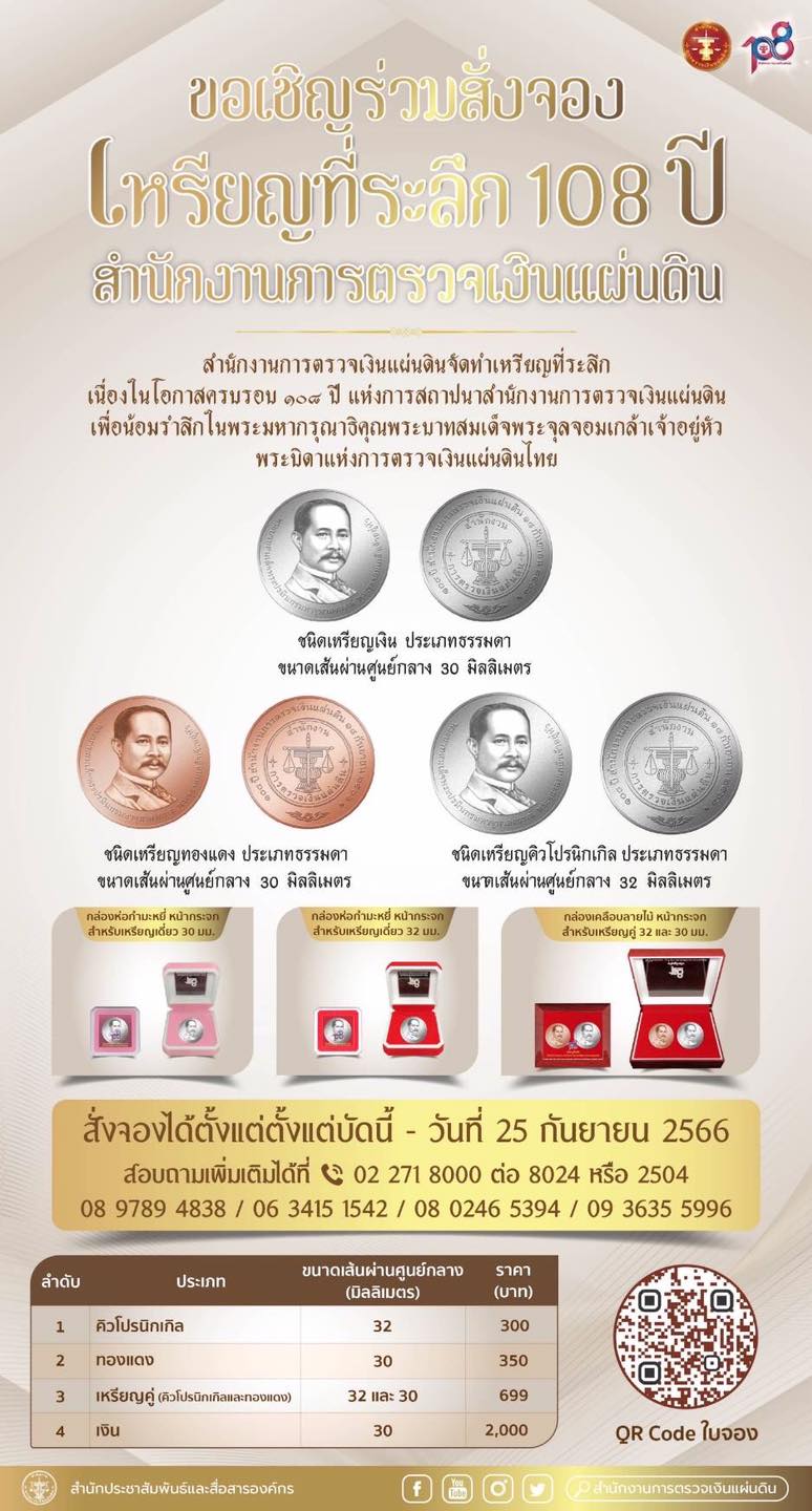 สำนักงานการตรวจเงินแผ่นดิน เปิดจองเหรียญที่ระลึก เนื่องในโอกาสครบรอบ 108 ปี แห่งการสถาปนาสำนักงานการตรวจเงินแผ่นดิน