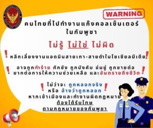 สถานเอกอัครราชทูต ณ กรุงพนมเปญ ขอแจ้งเตือนคนไทยที่กำลังคิดจะไปทำงานแก๊งคอลเซ็นเตอร์ หรือทำงานผิดกฎหมายอื่นๆ ในประเทศกัมพูชา คุณอาจถูกทำร้ายร่างกาย กักขัง ถูกบังคับให้ทำงาน ถูกข่มขู่ ถูกขายต่อ ซึ่งอาจเป็นอันตรายถึงชีวิตและยากต่อการให้ความช่วยเหลือ