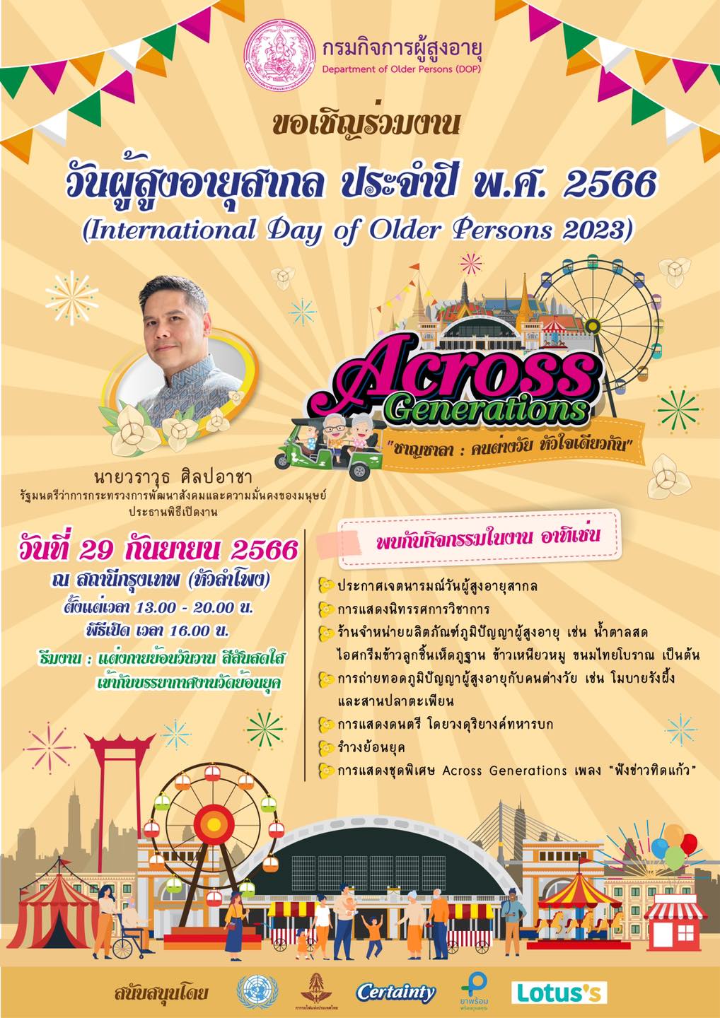 กรมกิจการผู้สูงอายุ ขอเชิญร่วมงาน “วันผู้สูงอายุสากล พ.ศ. 2566″ (International Day of Older Persons 2023) ภายใต้แนวคิด “ชาญชาลา : คนต่างวัย หัวใจเดียวกัน Across Generations” ในวันศุกร์ที่ 29 กันยายน 2566 เวลา 13.00 – 20.00 น. ณ สถานีกรุงเทพ (หัวลำโพง)