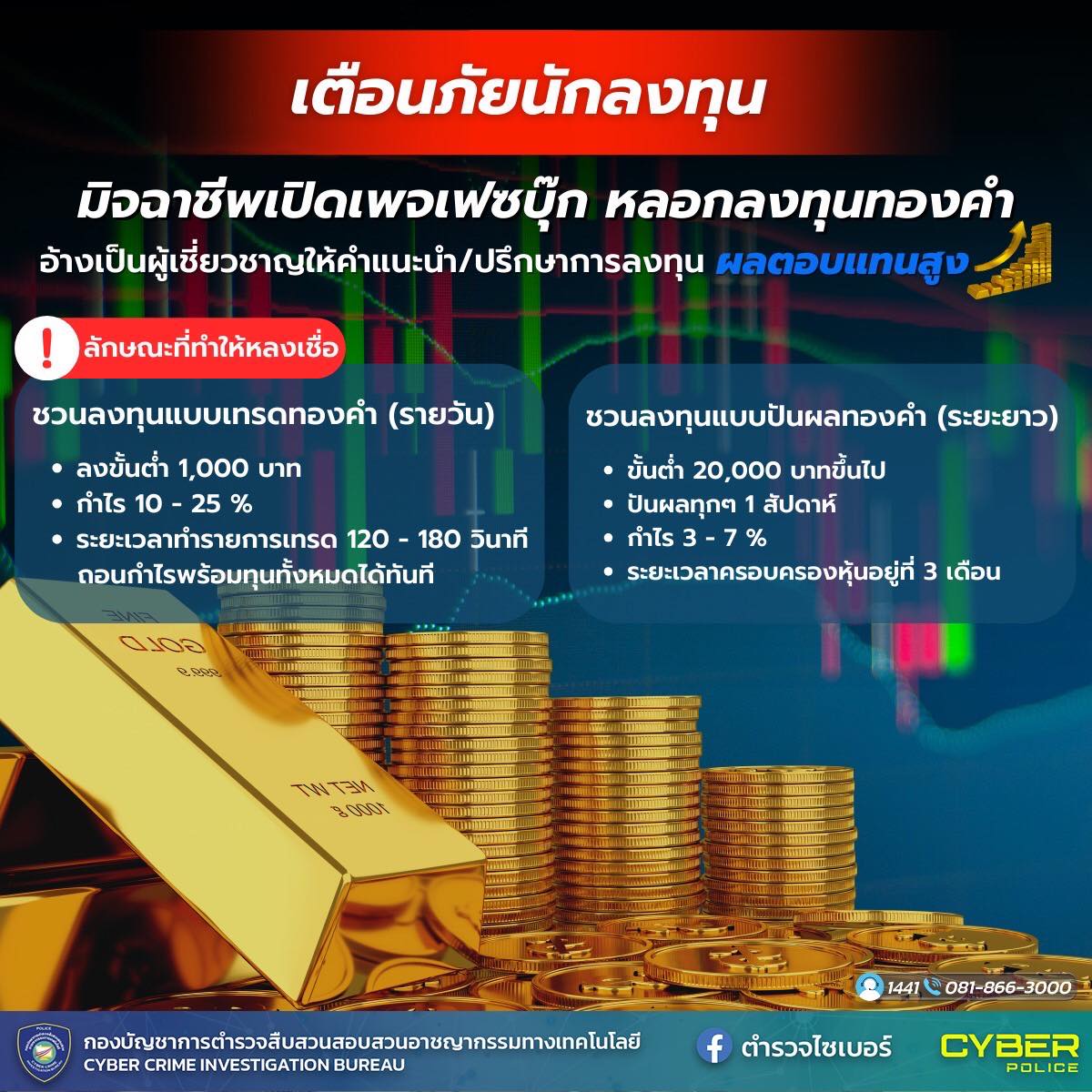 กองบัญชาการตำรวจสืบสวนสอบสวนอาชญากรรมทางเทคโนโลยี เตือนภัยนักลงทุน มิจฉาชีพหลอกลงทุนหุ้นทองคำ ผ่านเพจบน Facebook