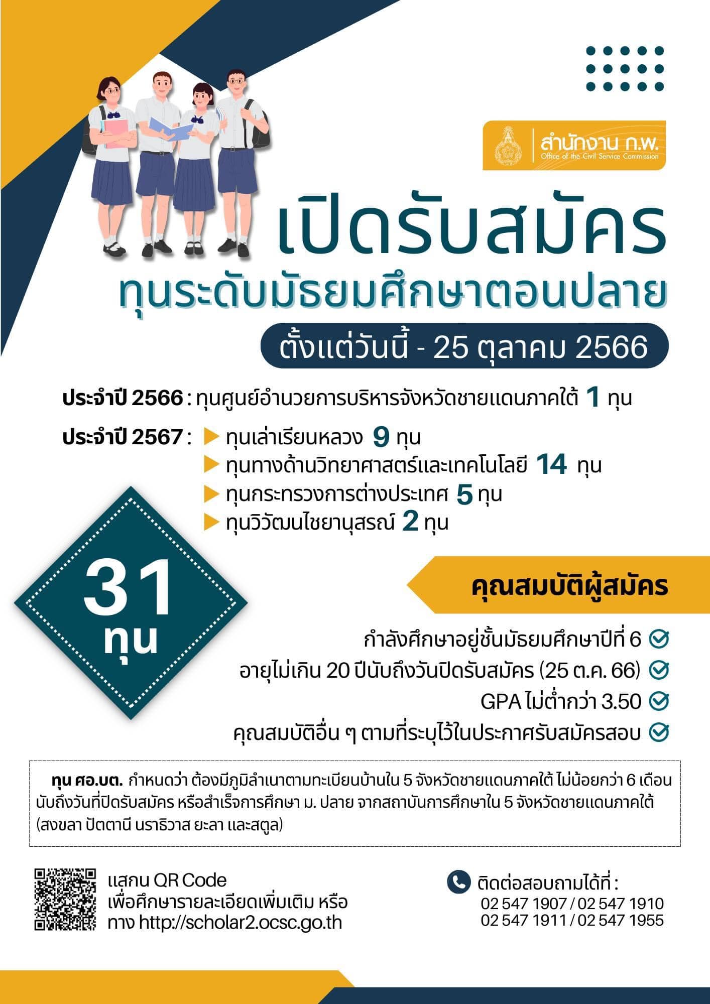 สำนักงานคณะกรรมการข้าราชการพลเรือน ประกาศเปิดรับสมัครทุนระดับมัธยมศึกษาตอนปลาย ประจำปี 2567