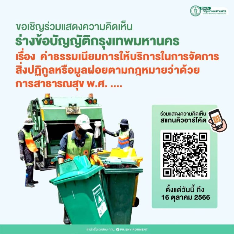 กรุงเทพมหานคร ขอเชิญร่วมแสดงความคิดเห็นต่อร่างข้อบัญญัติกรุงเทพมหานคร ผ่านระบบกลางทางกฎหมาย เรื่องค่าธรรมเนียมการให้บริการในการจัดการสิ่งปฏิกูลหรือมูลฝอยตามกฎหมายว่าด้วยการสาธารณสุข พ.ศ….. ตามลิงค์ https://www.law.go.th/listeningDetail?survey_id=Mjc0MERHQV9MQVdfRlJPTlRFTkQ= ตั้งแต่วันนี้ – 16 ตุลาคม 2566 หรือสอบถามเพิ่มเติม โทร. 0 2203 2935