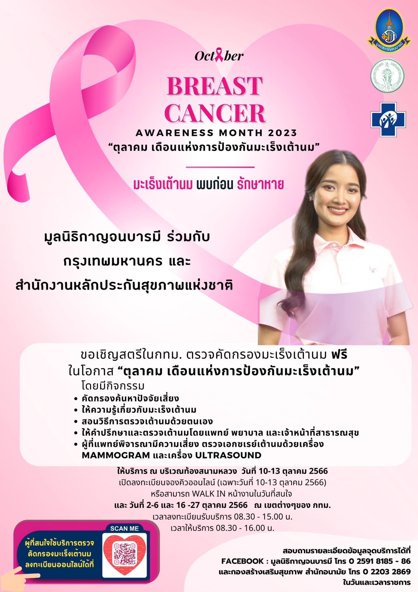 สำนักอนามัย กรุงเทพมหานคร เชิญชวน ตรวจมะเร็งเต้านม ฟรี วันที่ 10 -13 ตุลาคม 2566 ณ บริเวณท้องสนามหลวง สำหรับสตรีอายุ 25 ปีขึ้นไป และไม่อยู่ระหว่างตั้งครรภ์