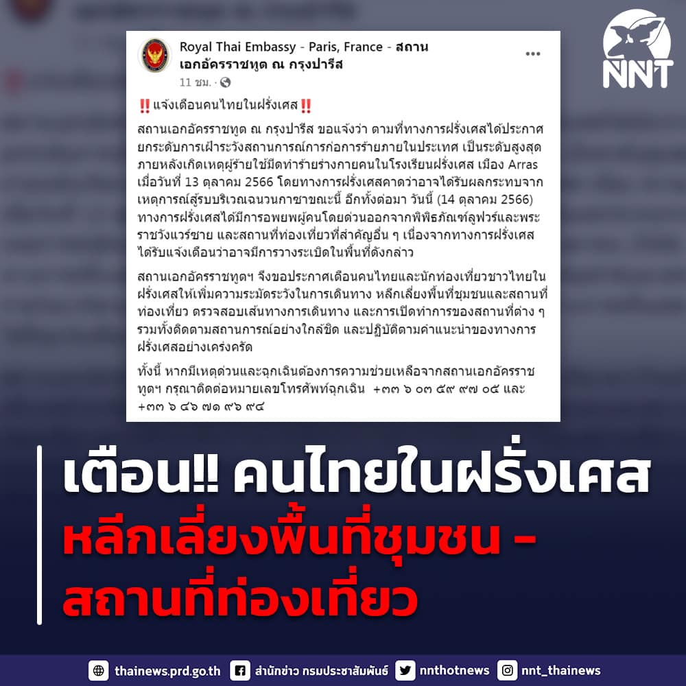 สถานเอกอัครราชทูต ณ กรุงปารีส ขอแจ้งว่า ตามที่ทางการฝรั่งเศสได้ประกาศยกระดับการเฝ้าระวังสถานการณ์การก่อการร้ายภายในประเทศ เป็นระดับสูงสุด ภายหลังเกิดเหตุผู้ร้ายใช้มีดทำร้ายร่างกายคนในโรงเรียนฝรั่งเศส เมือง Arras เมื่อวันที่ 13 ตุลาคม 2566 โดยทางการฝรั่งเศสคาดว่าอาจได้รับผลกระทบจากเหตุการณ์สู้รบบริเวณฉนวนกาซาขณะนี้ อีกทั้งต่อมา ในวันที่14 ตุลาคม 2566 ทางการฝรั่งเศสได้มีการอพยพผู้คนโดยด่วนออกจากพิพิธภัณฑ์ลูฟวร์และพระราชวังแวร์ซาย และสถานที่ท่องเที่ยวที่สำคัญอื่น ๆ เนื่องจากทางการฝรั่งเศสได้รับแจ้งเตือนว่าอาจมีการวางระเบิดในพื้นที่ดังกล่าว