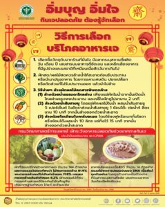 นายแพทย์ยงยศ กล่าวต่อว่า การรับประทานอาหารเจที่เลียนแบบเนื้อสัตว์ ผู้บริโภคหรือผู้ปรุงอาหาร ควรเลือกซื้อวัตถุดิบจากร้านที่มั่นใจและอาหารต้องมีฉลากระบุ สถานที่ผลิต วันเดือนปี และเลขสาระบบอาหารที่ชัดเจน เพราะถ้าแหล่งผลิตไม่ได้มาตรฐานบางครั้งอาจมีส่วนประกอบ เช่น ไข่ นมหรือเนื้อสัตว์ปนเปื้อน และหลีกเลี่ยงการรับประทานหรือซื้ออาหารที่มีการแปรรูป และรสชาติที่เหมือนเนื้อสัตว์มากจนเกินไป สำหรับผักและผลไม้สดควรล้างน้ำให้สะอาดก่อนรับประทานหรือนำมาปรุงอาหาร โดยการล้างให้ถูกวิธีตามคำแนะนำของกระทรวงสาธารณสุข เริ่มตั้งแต่การเตรียมผักโดยเคาะเอาเศษดิน ปอกเปลือก หรือตัดส่วนที่ไม่รับประทานออก แล้วจึงนำผักผลไม้มาล้าง เพื่อสารพิษตกค้างด้วย 3 ขั้นตอนง่ายๆ ดังนี้ ล้างด้วยน้ำสะอาด เพียงแช่ผักในน้ำ จากนั้นเปิดน้ำไหลผ่านแรงพอประมาณ และคลี่ใบผักถูไปมานาน 2 นาที ล้างด้วยน้ำส้มสายชู โดยแช่ผักผลไม้ในน้ำผสมน้ำส้มสายชู 5 เปอร์เซ็นต์ ในอัตราส่วนน้ำส้มสายชู 1 ช้อนโต๊ะต่อน้ำ 4 ลิตร นาน 10 นาที แล้วล้างออกด้วยน้ำสะอาด ล้างด้วยโซเดียมไบคาร์บอเนต โดยใช้ผงฟูหรือเบกกิ้งโซดาครึ่งช้อนโต๊ะผสมน้ำ 10 ลิตร แช่ทิ้งไว้ 15 นาที แล้วล้างออกด้วยน้ำสะอาด เพียงเท่านี้ผู้บริโภคก็จะกินเจได้อย่างปลอดภัยต่อสุขภาพ และอิ่มบุญ อิ่มใจ ตลอดช่วงเทศกาลกินเจปีนี้