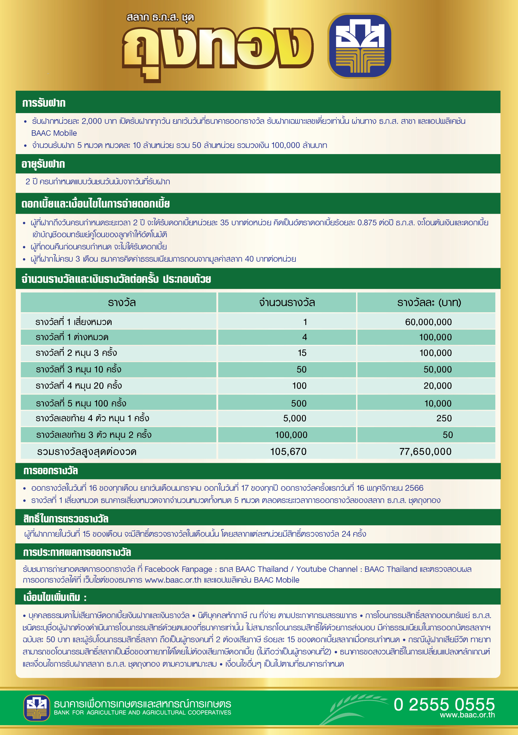 ธ.ก.ส. ฉลองก้าวสู่ปีที่ 58 เปิดตัว “สลาก ธ.ก.ส. ชุดถุงทอง” หน่วยละ 2,000 บาท ลุ้นรางวัลที่ 1 Grand Prize มูลค่า 60 ล้านบาท และรางวัลอื่น ๆ รวมมูลค่ากว่า 77 ล้านบาทต่อเดือน ถึง 24 ครั้ง แบ่งเป็น 5 หมวด ๆ ละ 10 ล้านหน่วย รวมวงเงินรับฝาก 100,000 ล้านบาท เมื่อฝากครบ 2 ปี ได้รับดอกเบี้ยทันที 0.875% ดอกเบี้ยและเงินรางวัลสำหรับบุคคลธรรมดาไม่เสียภาษี เปิดรับฝากวันที่ 1 พฤศจิกายนนี้ ผ่านแอปพลิเคชัน BAAC Mobile และ ธ.ก.ส. ทุกสาขา