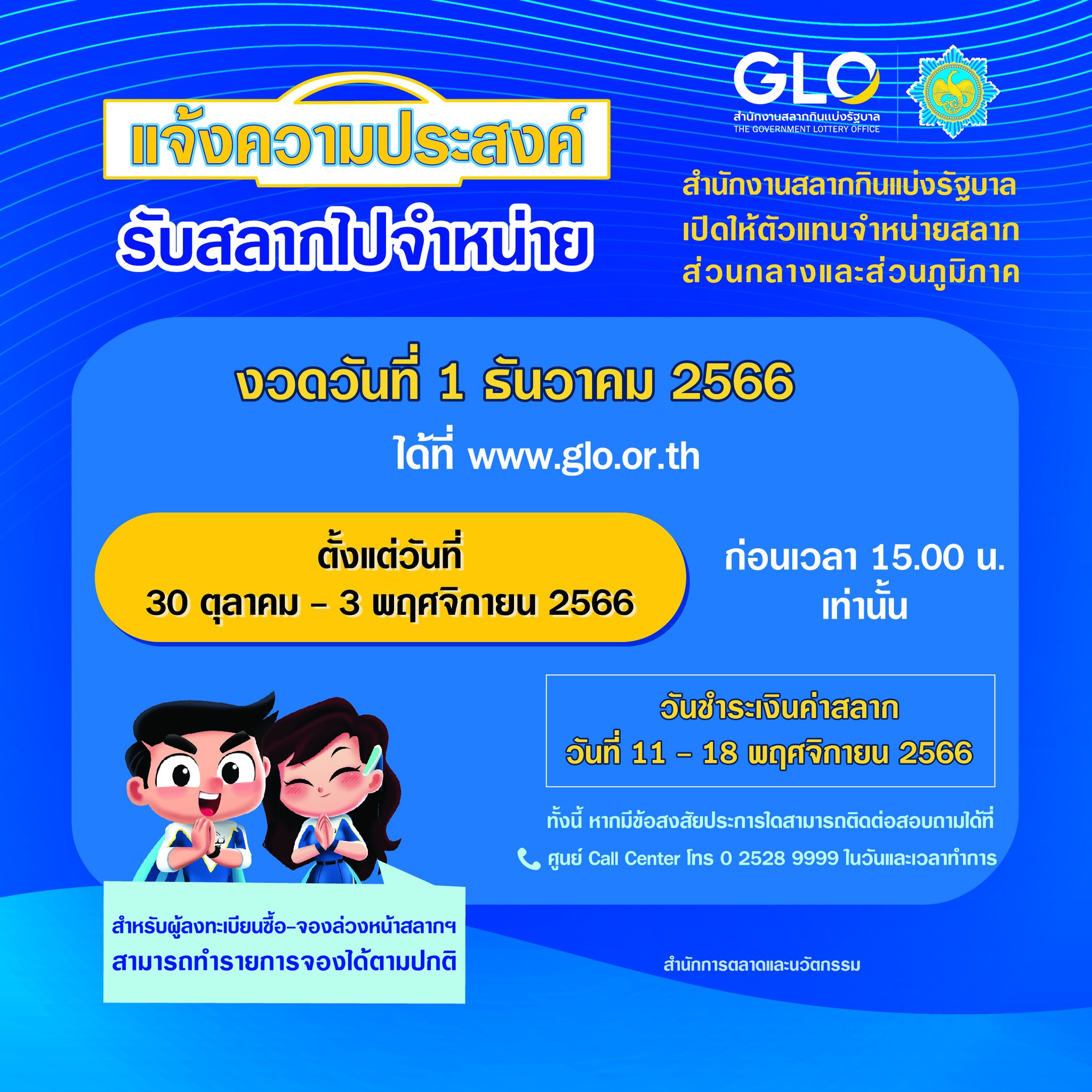 สำนักงานสลากกินแบ่งรัฐบาล เปิดให้ตัวแทนจำหน่ายสลากส่วนกลางและส่วนภูมิภาคแจ้งความประสงค์รับสลากไปจำหน่าย งวดวันที่ 1 ธันวาคม 2566 ได้ที่ www.glo.or.th ตั้งแต่วันที่ 30 ตุลาคม-3 พฤศจิกายน 2566 ก่อนเวลา 15.00 น. เท่านั้น กำหนดวันชำระเงินค่าสลาก วันที่ 11-18 พฤศจิกายน 2566