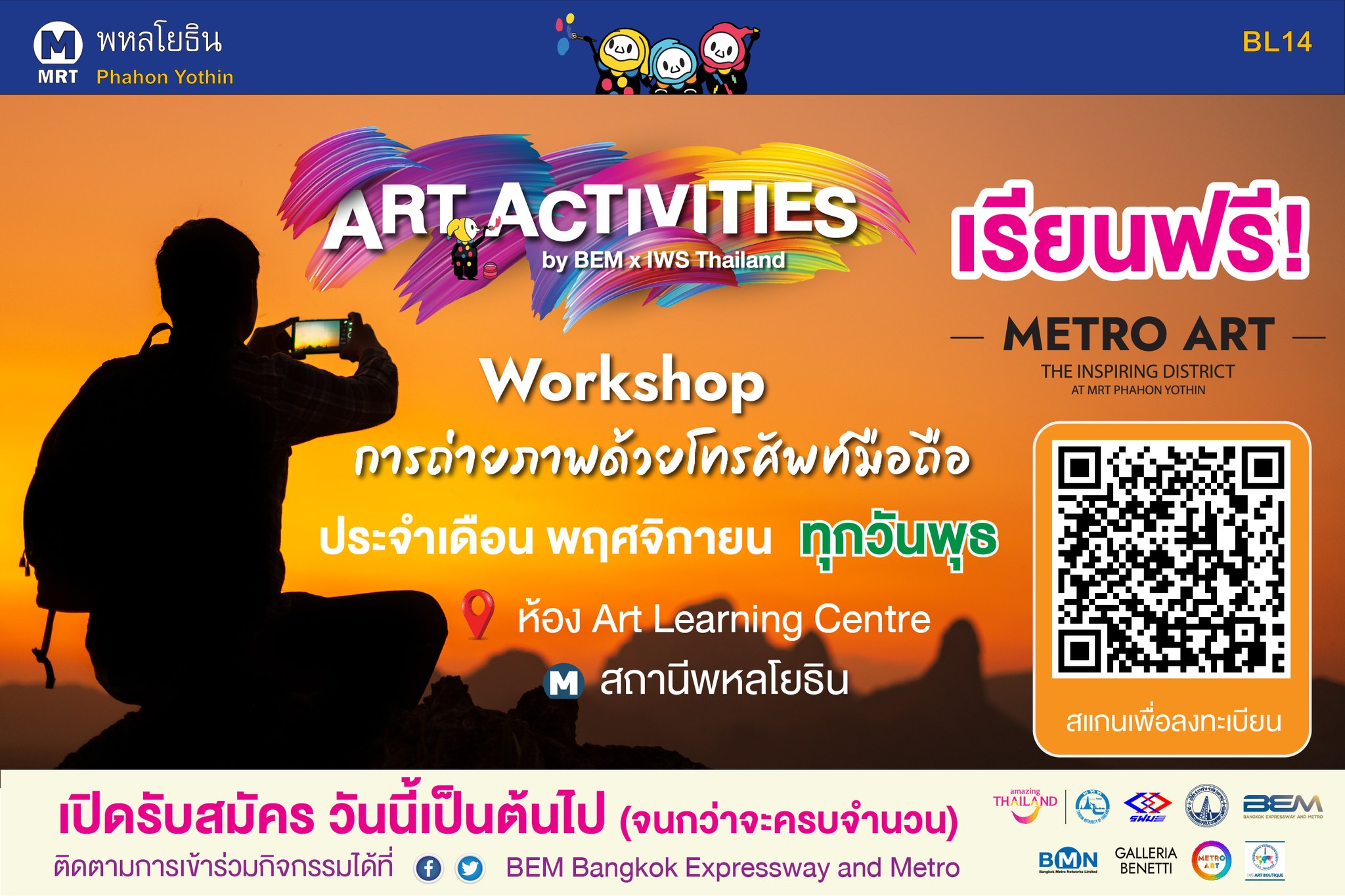 เดือนพฤศจิกายนนี้ BEM ชวนปลดล็อกศักยภาพของตัวเอง แล้วร่วมเดินทางสู่ประสบการณ์แห่งการถ่ายภาพที่สนุกสนานไปกับ Workshop “การถ่ายภาพด้วยโทรศัพท์มือถือ” Happy Photography by Mobile Phone หนึ่งใน Art Activities ประจำเดือนที่จัดขึ้น ณ Metro Art สถานีพหลโยธิน โดยกิจกรรมจะถูกจัดขึ้นทุกวันพุธตลอดเดือนพฤศจิกายน